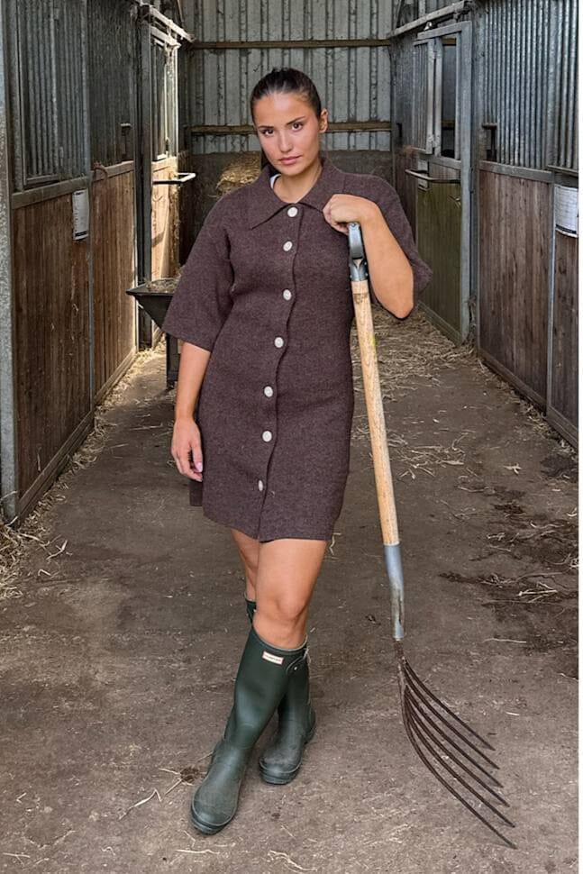Donkerbruin gebreid jurkje van BYIC met overhemdkraag en knopen helemaal naar beneden. Het heeft 3/4-mouwen en een rechte snit die tot halverwege het bovenbeen komt.