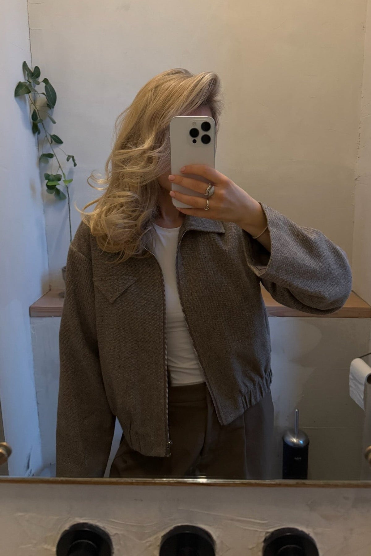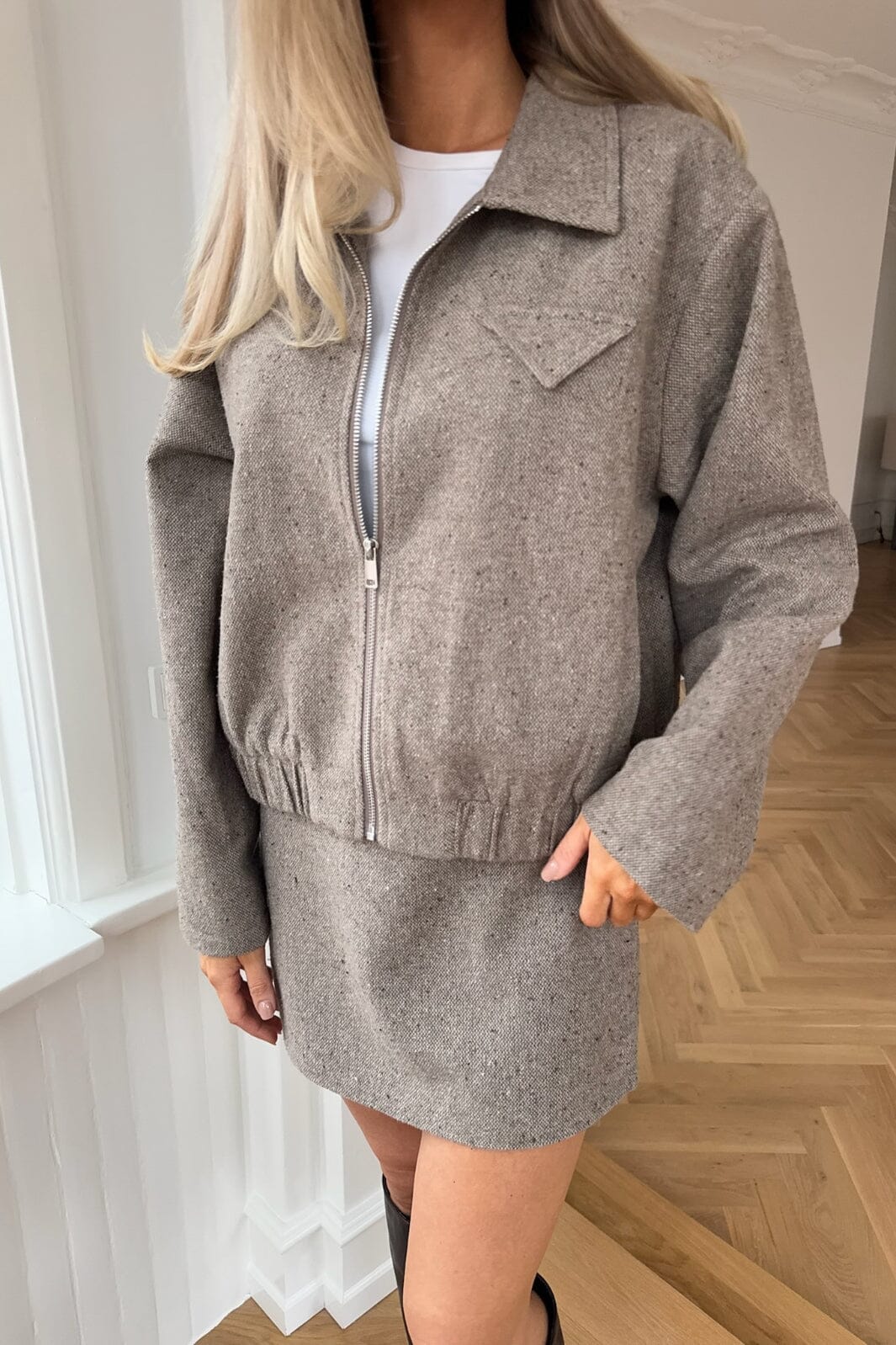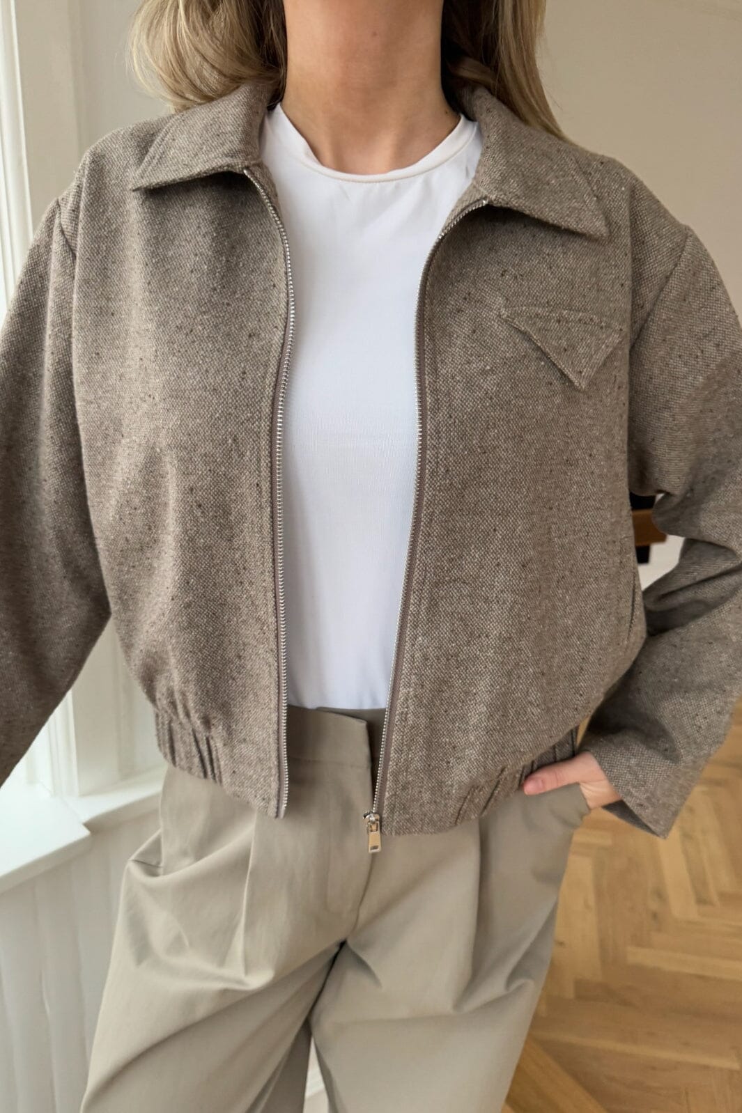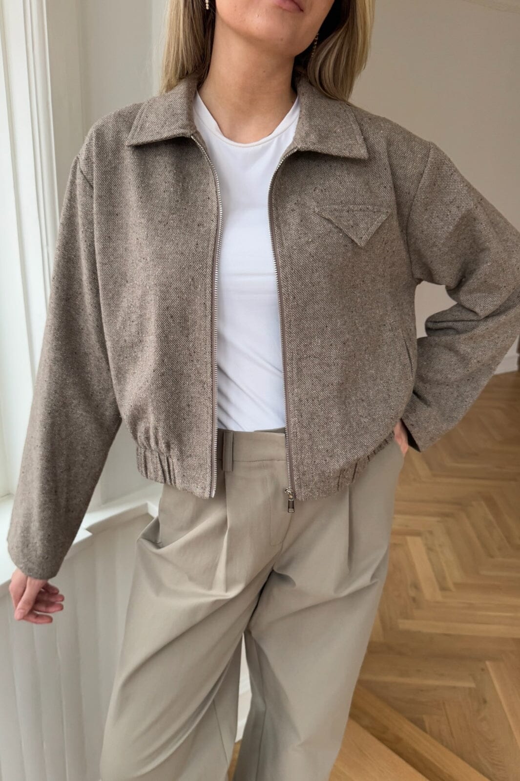 Korte jas van BYIC in bruin melange. Hij heeft een overhemdkraag, ritssluiting en ruchesdetails. De jas combineert een kort ontwerp met praktische details zoals zakken en elastiek aan de onderkant.