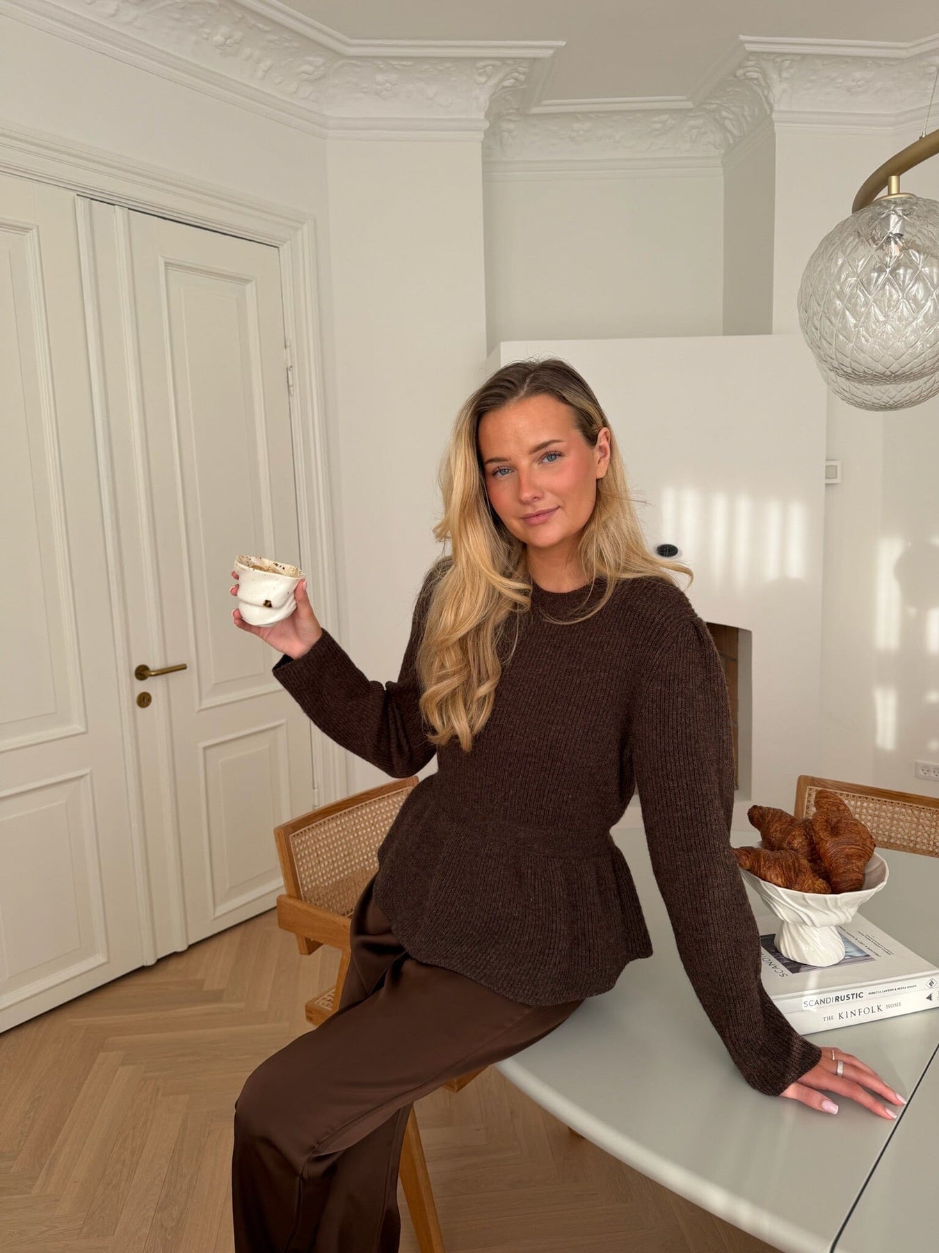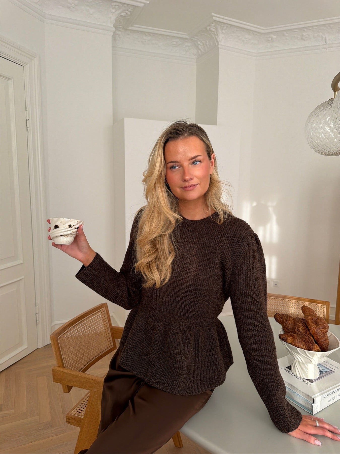 Donkerbruine trui van BYIC met een ribgebreide textuur en peplum-effect in de taille. De trui heeft een slim fit-pasvorm en een ronde halslijn.