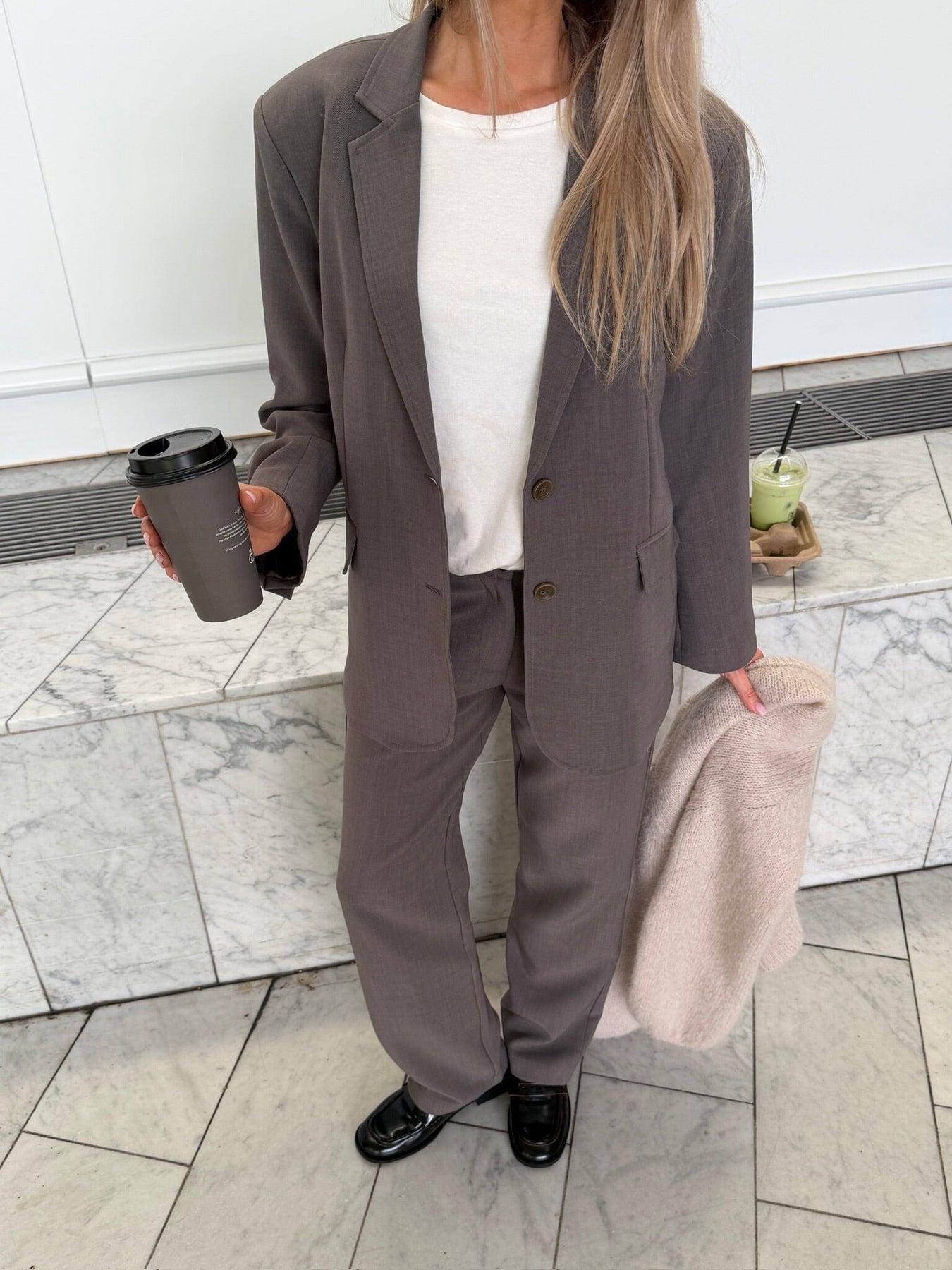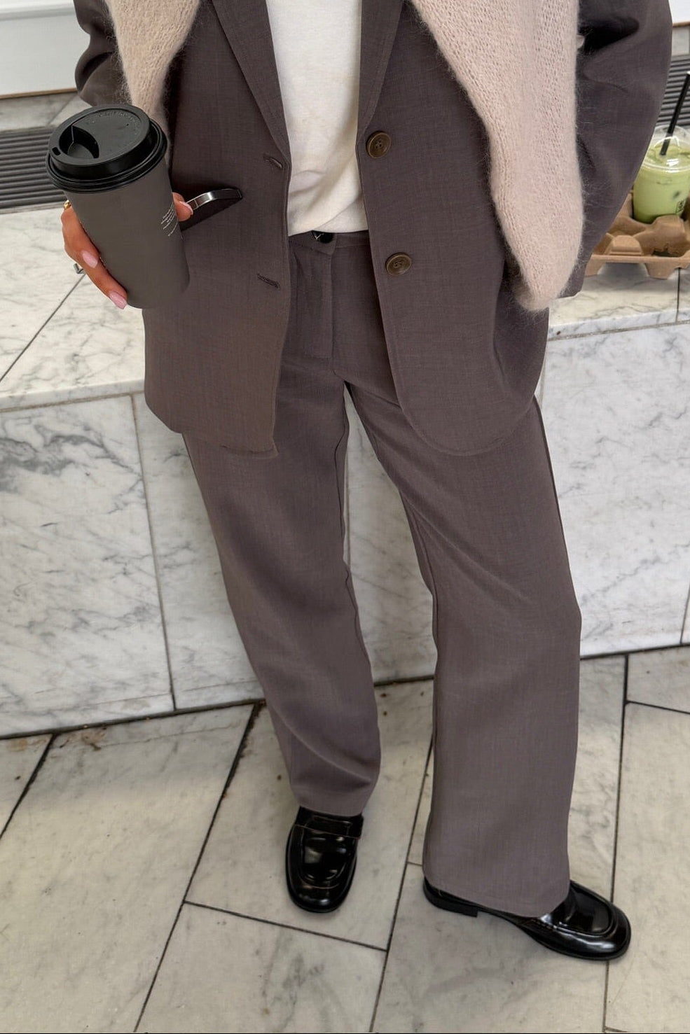 Grijze broek van BYIC, gemaakt van polyester. De broek heeft rechte pijpen met riemlussen en zichtbare zijzakken, waardoor hij praktisch is voor zowel casual als formele gelegenheden.