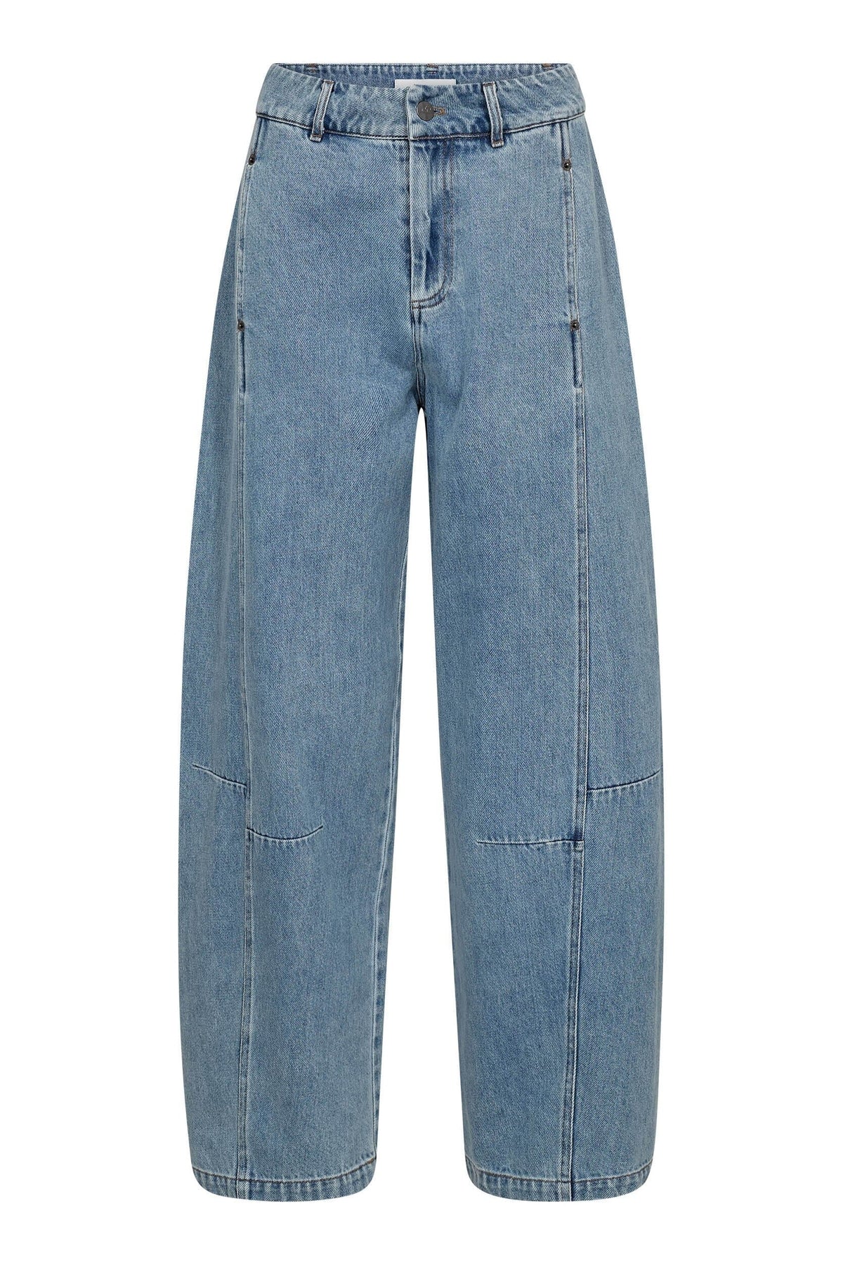 Lichtblauwe jeans van Co'Couture in denim. De jeans hebben een losse pasvorm met wijde pijpen en decoratieve stiksels.