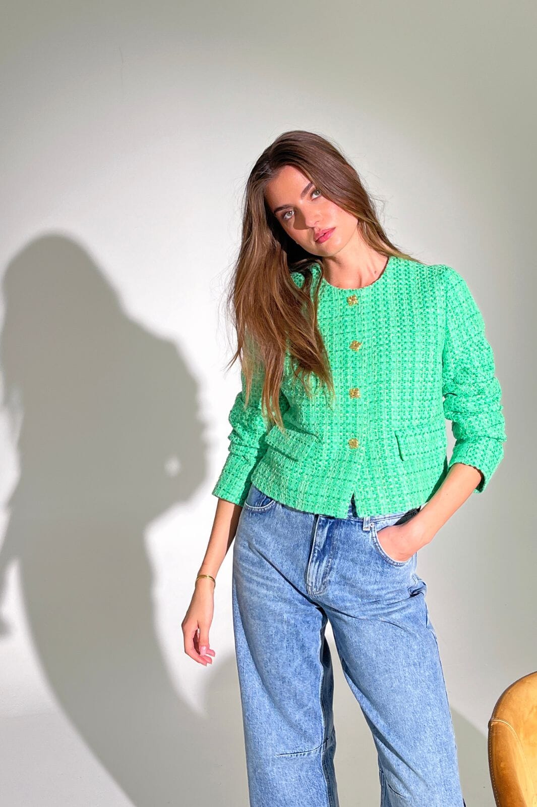 Groen bouclé-jack van Co´Couture met vier goudkleurige knopen en twee voorzakken met klep. Het jack heeft een ronde halslijn en lange mouwen.