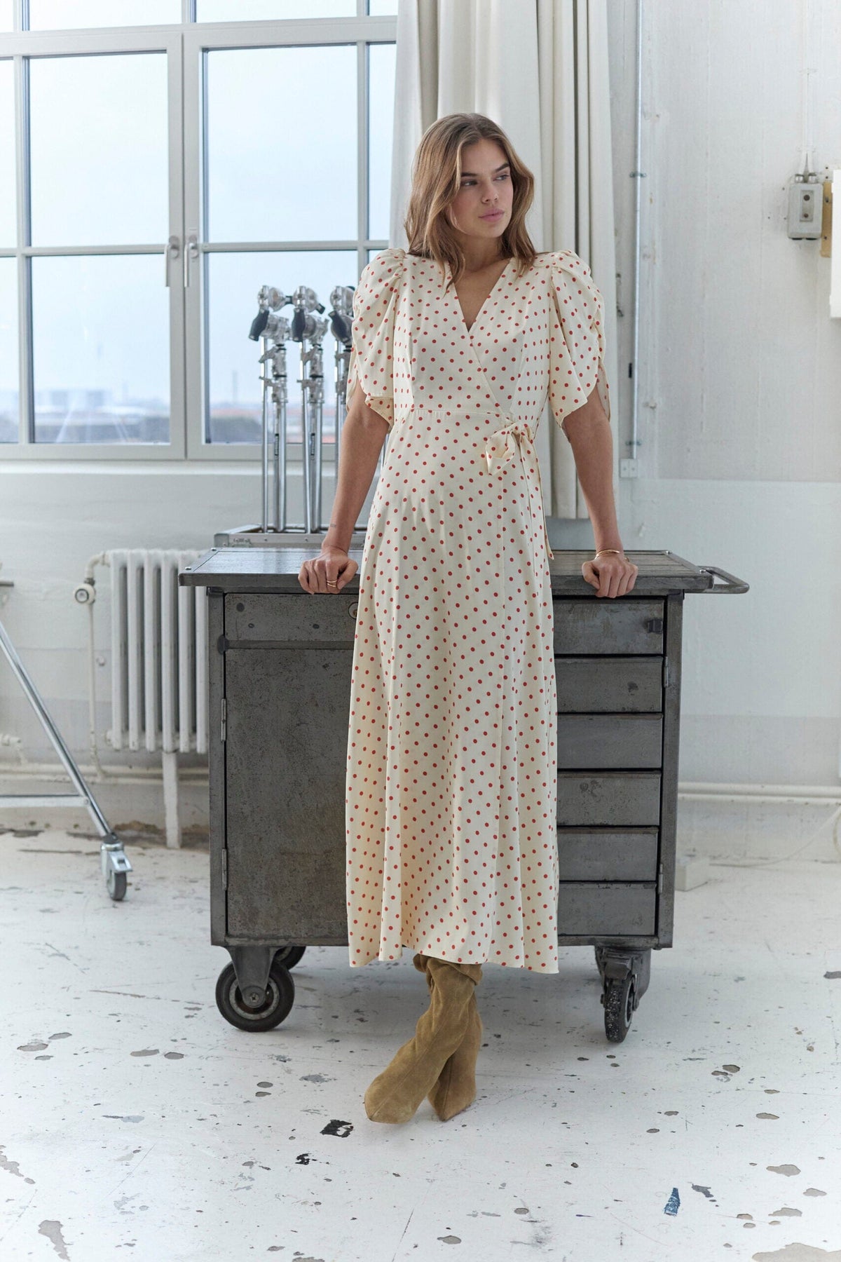 Wikkeljurk van Co´Couture in wit met rode stippen. De jurk heeft pofmouwen en een V-hals die een vrouwelijke uitstraling geeft.