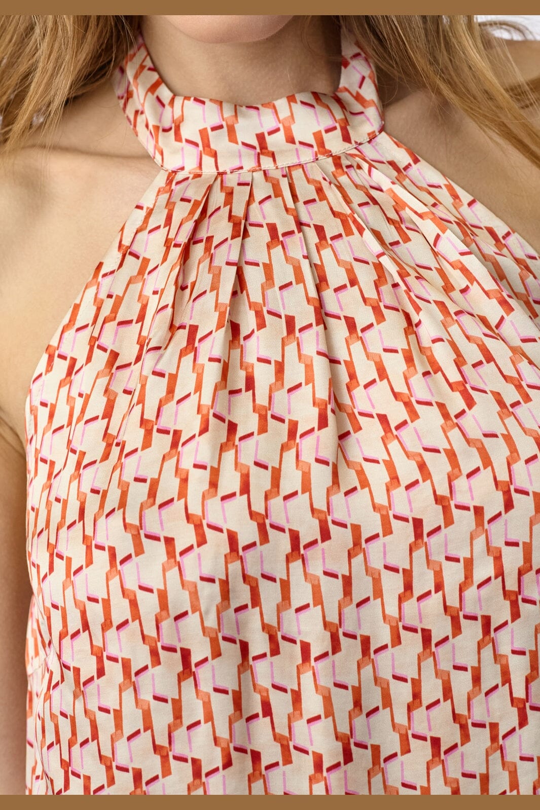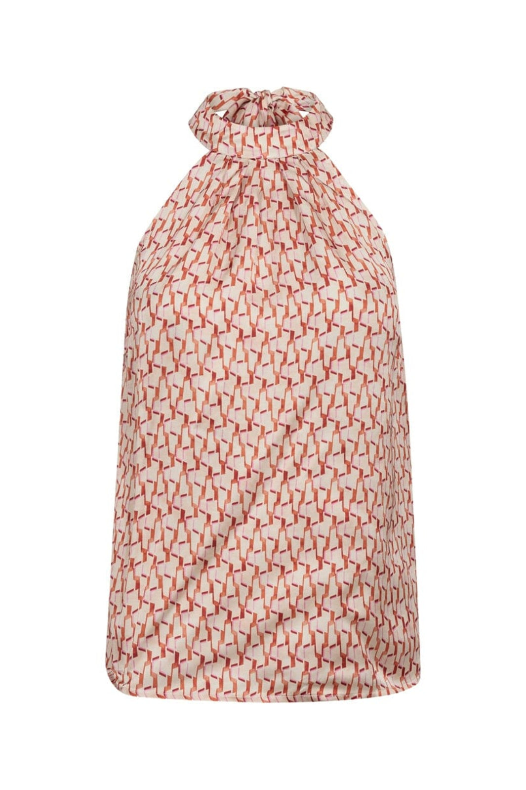 Haltertop van Co´Couture van 100% viscose met een geometrisch patroon in rode, roze en oranje tinten op een lichte achtergrond.