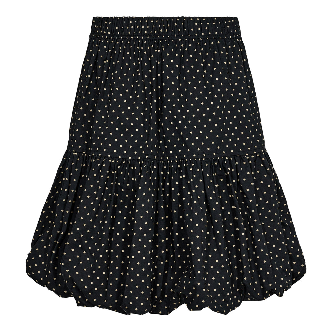 Zwarte rok van Co´Couture met stippen en gerimpelde rand. Het heeft een losse ballonvorm en is gemaakt van een lichte stof met elastische tailleopening.
