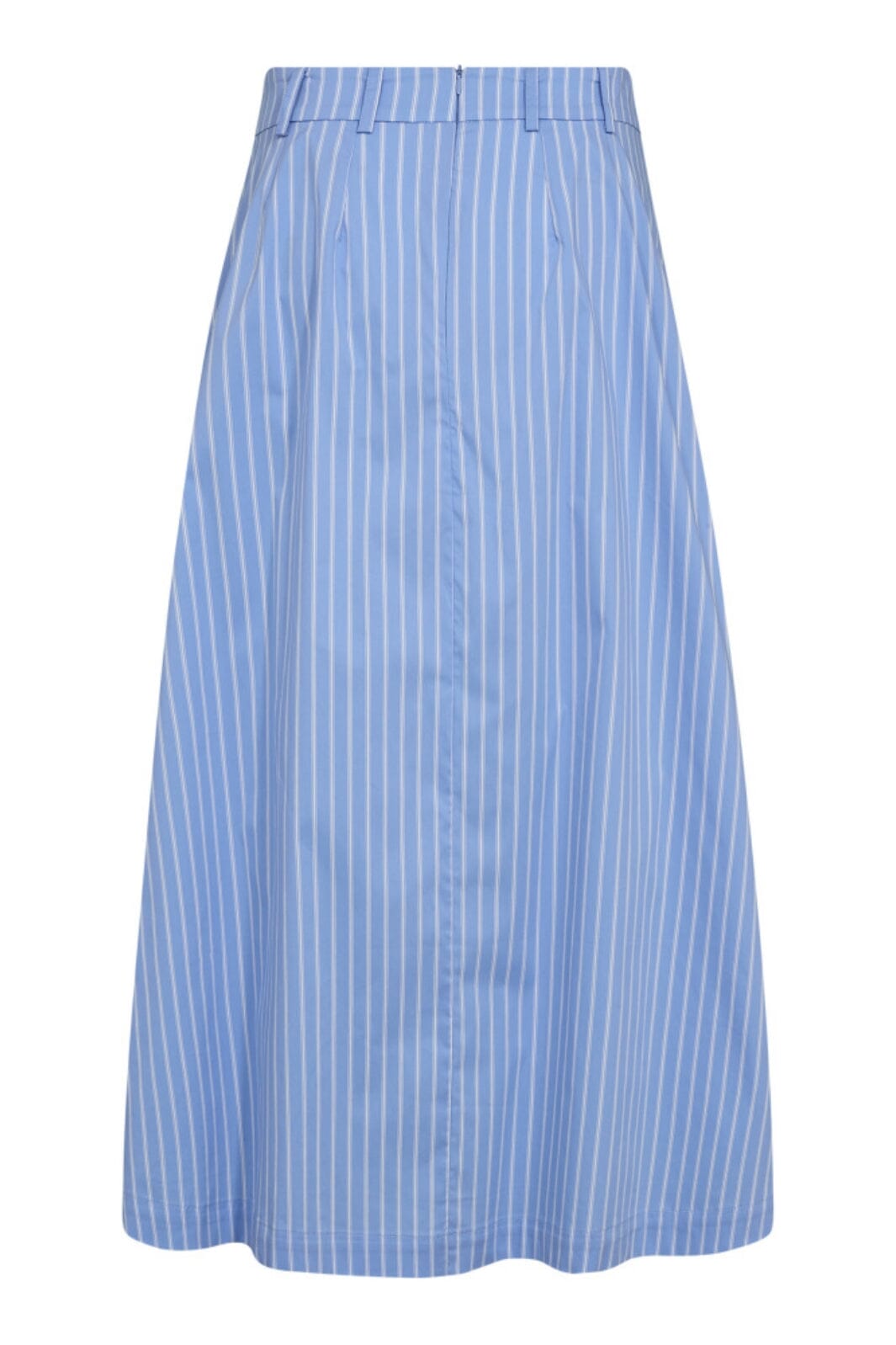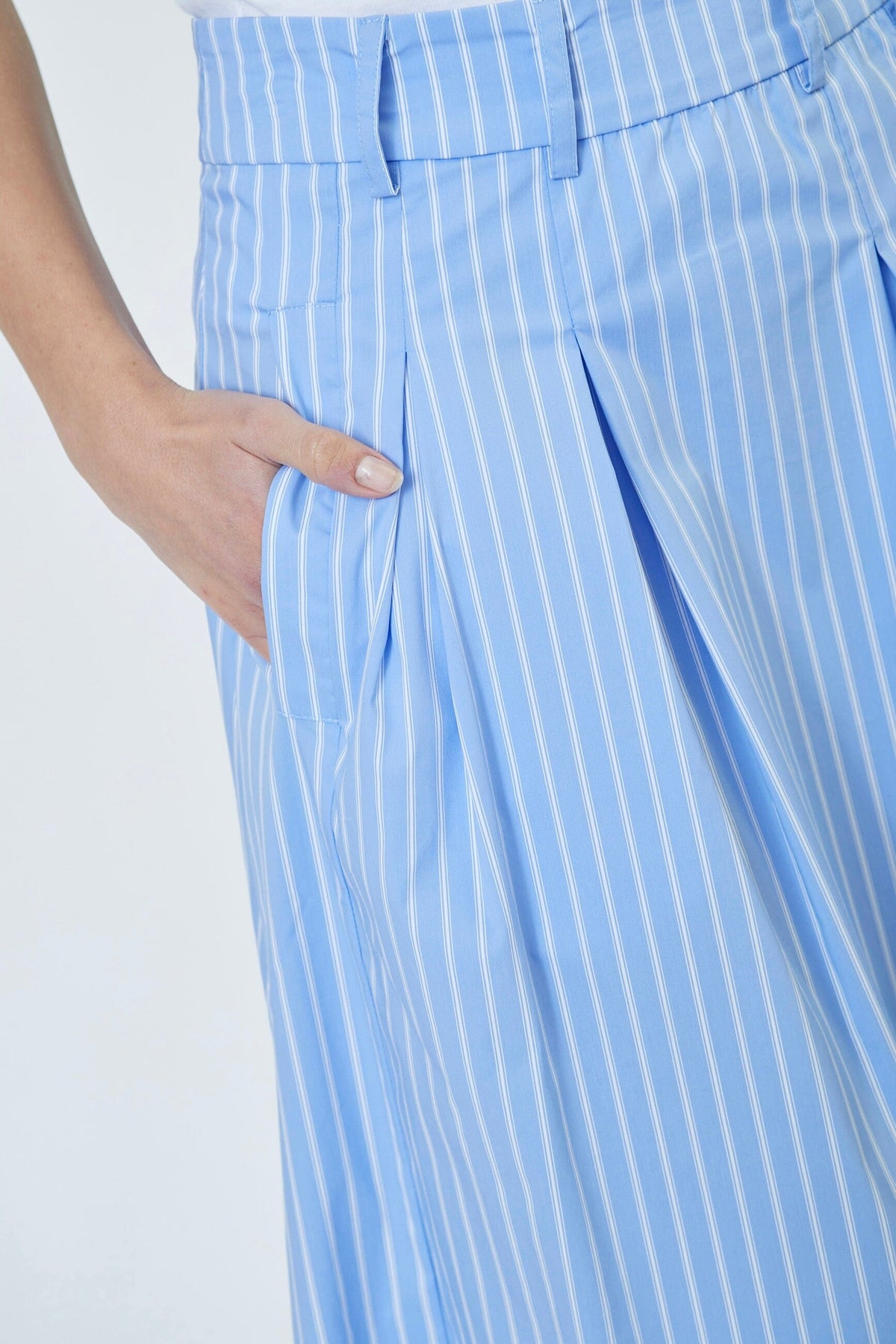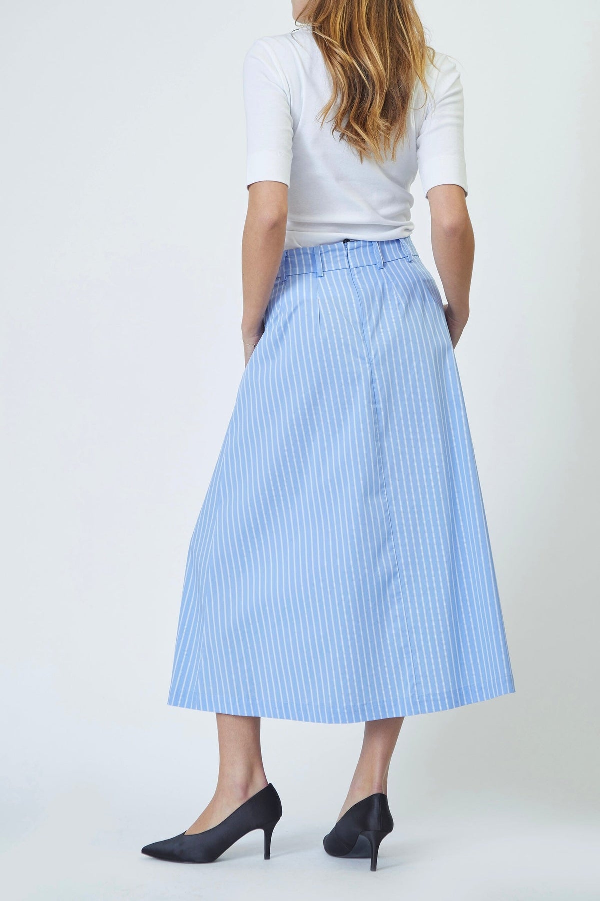 Lichtblau plissérok van Co'Couture met witte strepen. Het heeft midi-lengte en is uitgerust met een rits en knopen in de taille.