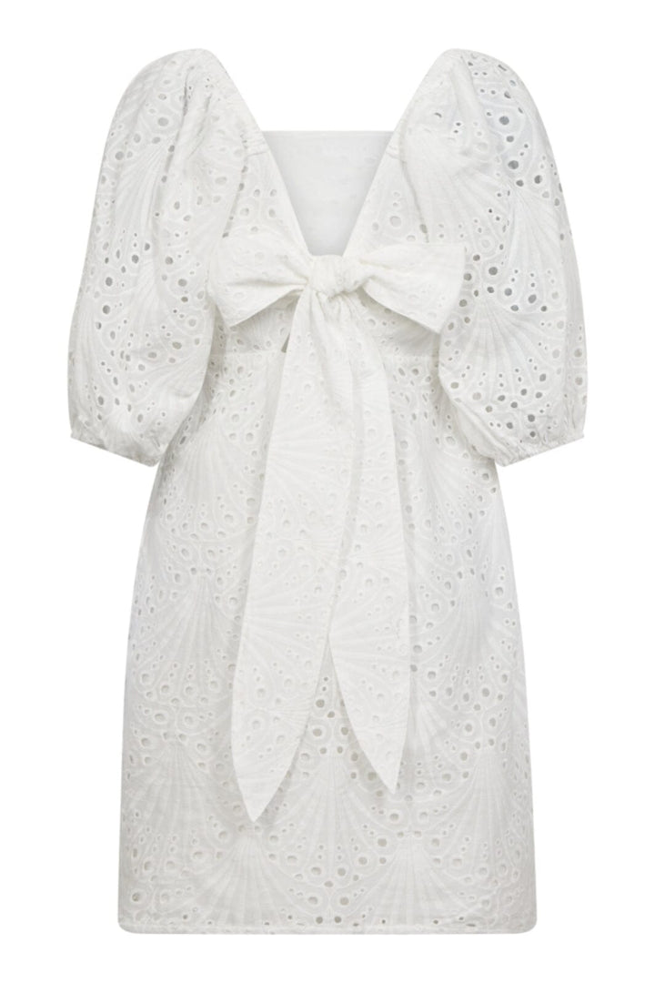 Witte jurk van Co´Couture met anglaise-borduurwerk. De jurk heeft puffmouwen, een vierkante halslijn en een knoopdetail op de rug.