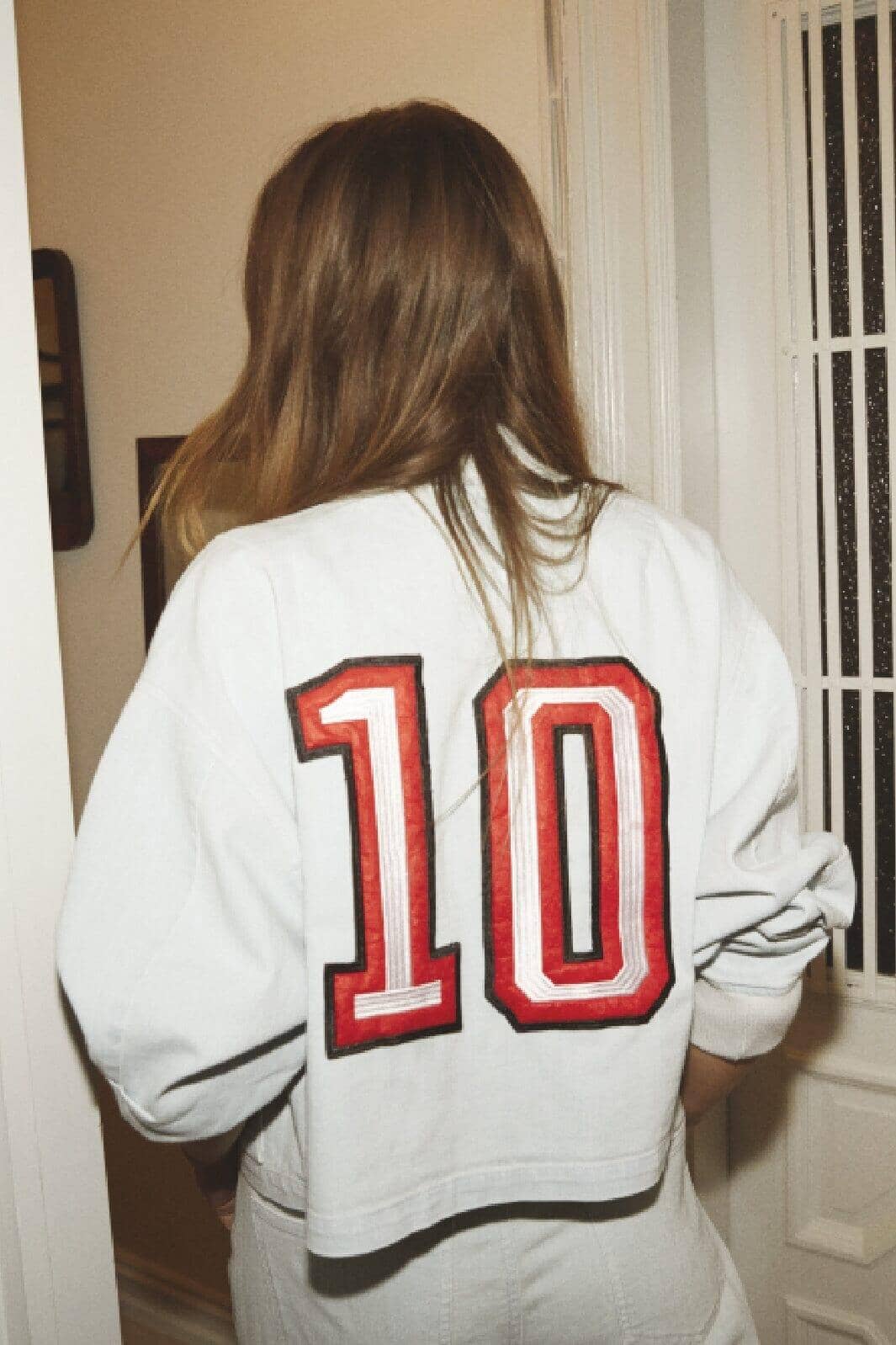 Denim bomberjack van Co´Couture in een lichte, vervaagde denimkleur. Het korte model heeft een groot nummer 10 op de rug in rood en wit.