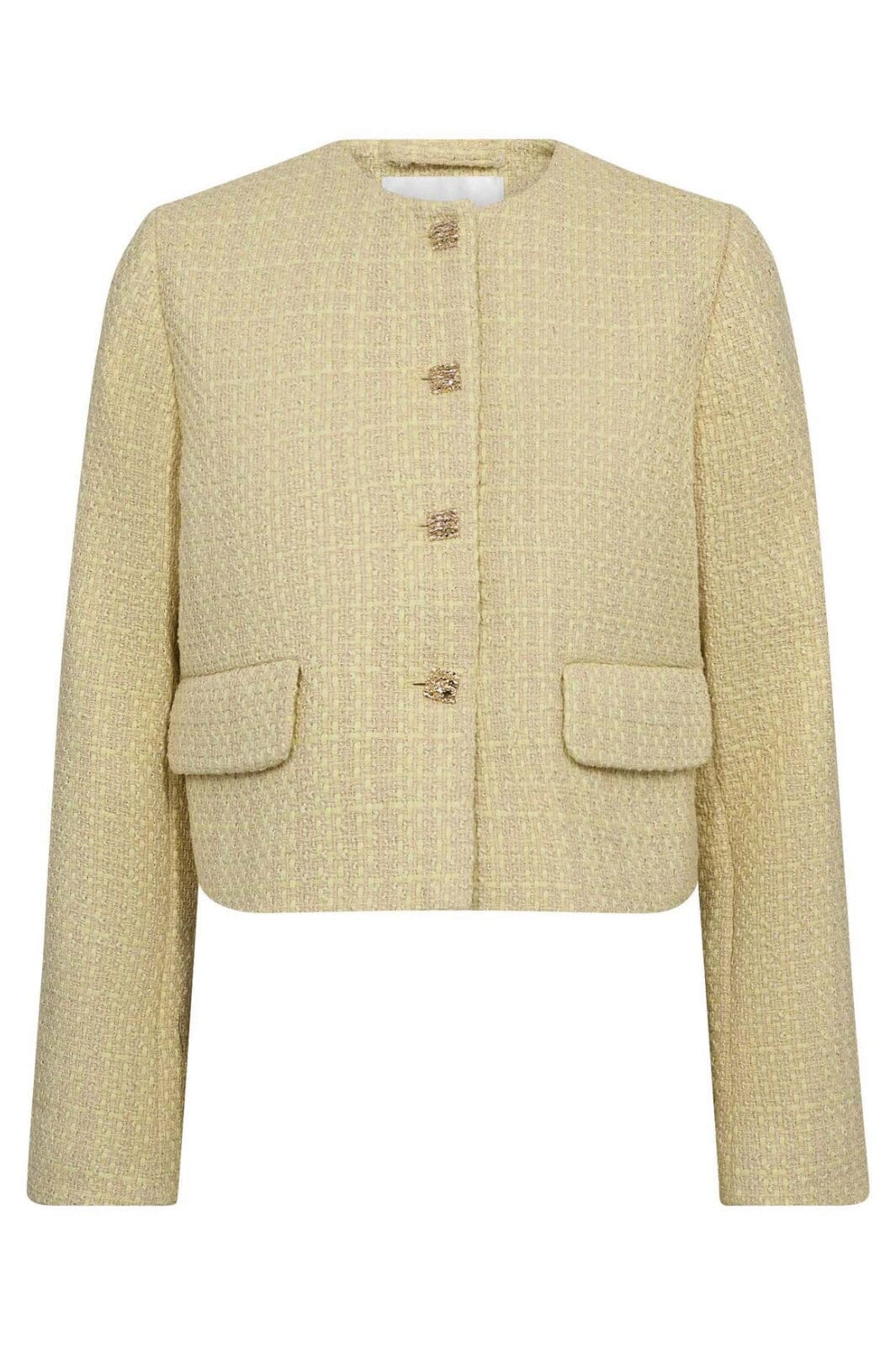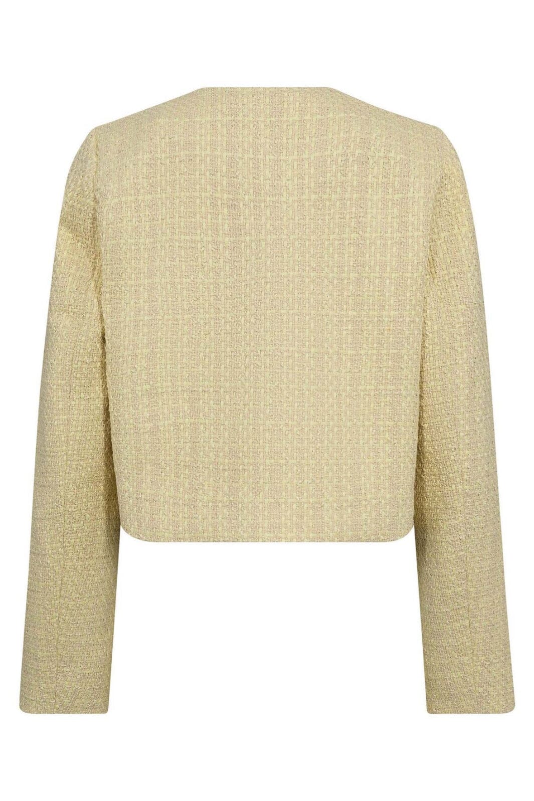 Bouclé-jack van Co'Couture in pastelgeel. Het korte model heeft een knoopsluiting aan de voorkant en twee zakken. De stof heeft een gestructureerd oppervlak met een geweven patroon.