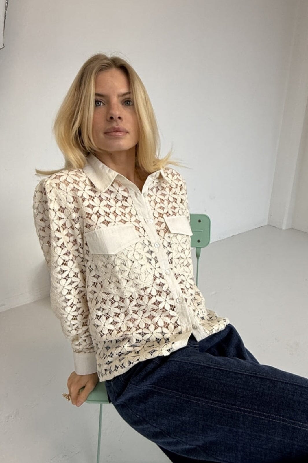 Kanten blouse van Continue in offwhite, gemaakt van 100% katoen. De blouse heeft een bloemachtig kantpatroon en twee voorzakken.