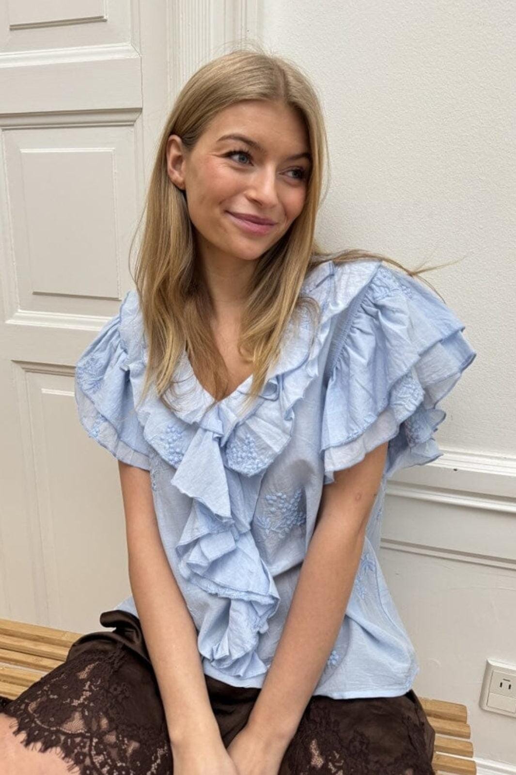 Lichtblauwe blouse van Continue met ruches en geborduurde bloemendetails. De blouse heeft een V-hals en korte mouwen met meerdere lagen ruches.