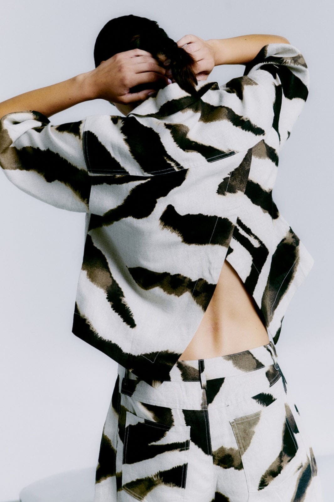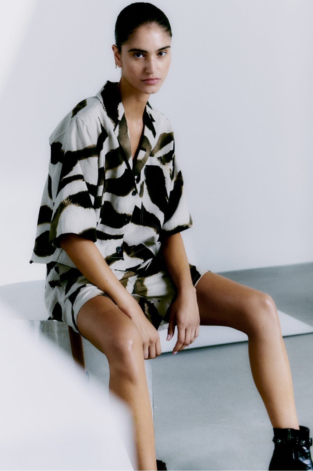 Shirt van Copenhagen Muse in beige en zwart dierenprint. Het shirt heeft korte mouwen en een overhemdkraag met knoopsluiting aan de voorkant. Het is gemaakt van een mix van lyocell en linnen.