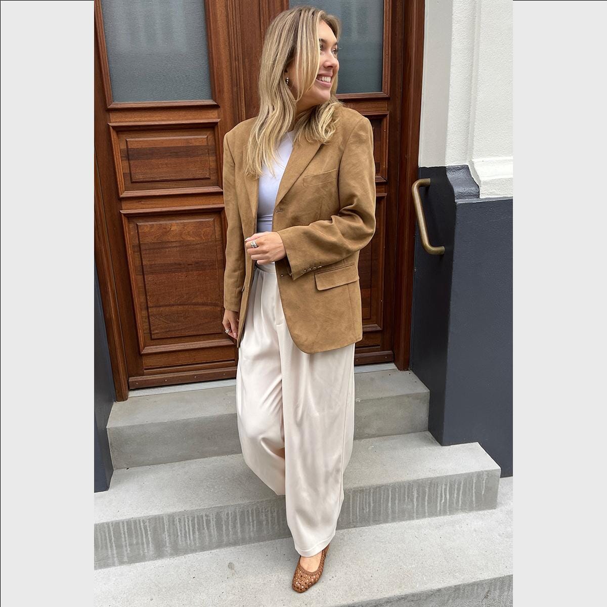 Een ballerina van Copenhagen Shoes, gemaakt van suède in een bruine cognackleur. De schoen heeft een gevlochten bovenkant en een open hielriem.
