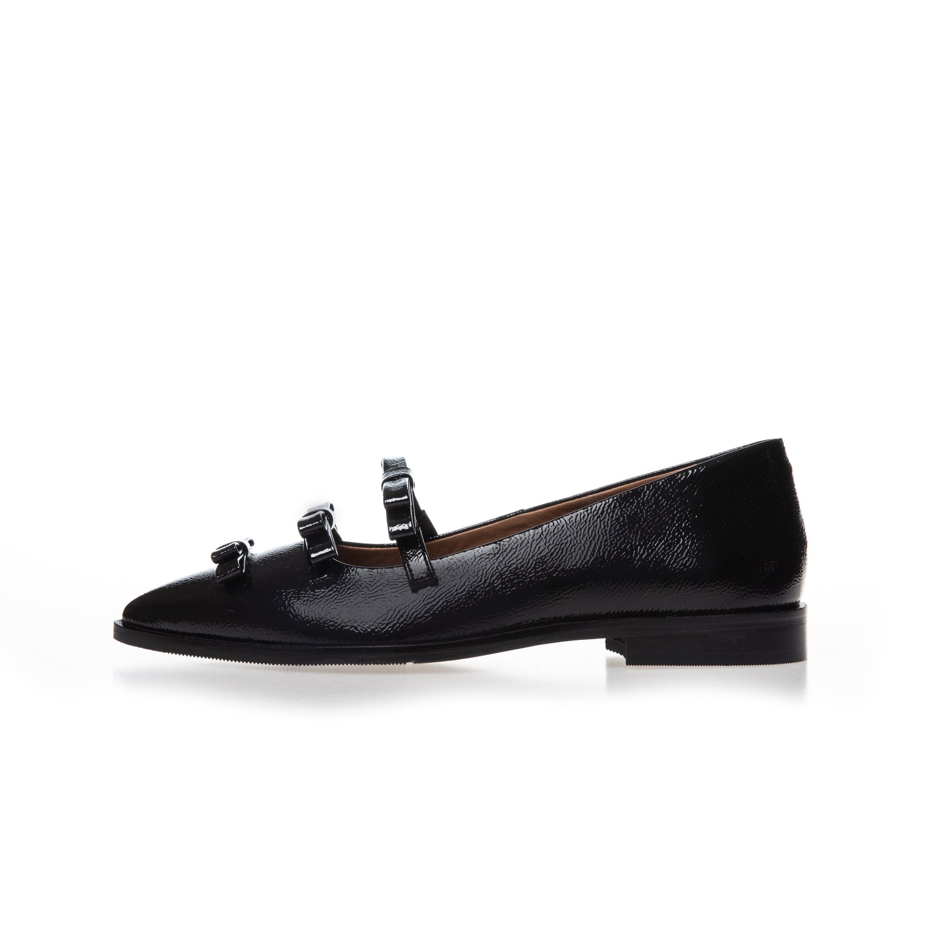 Zwarte lakleren schoenen van Copenhagen Shoes met een spitse neus en twee bandjes over de wreef. Het glanzende oppervlak geeft de schoenen een gepolijste uitstraling.