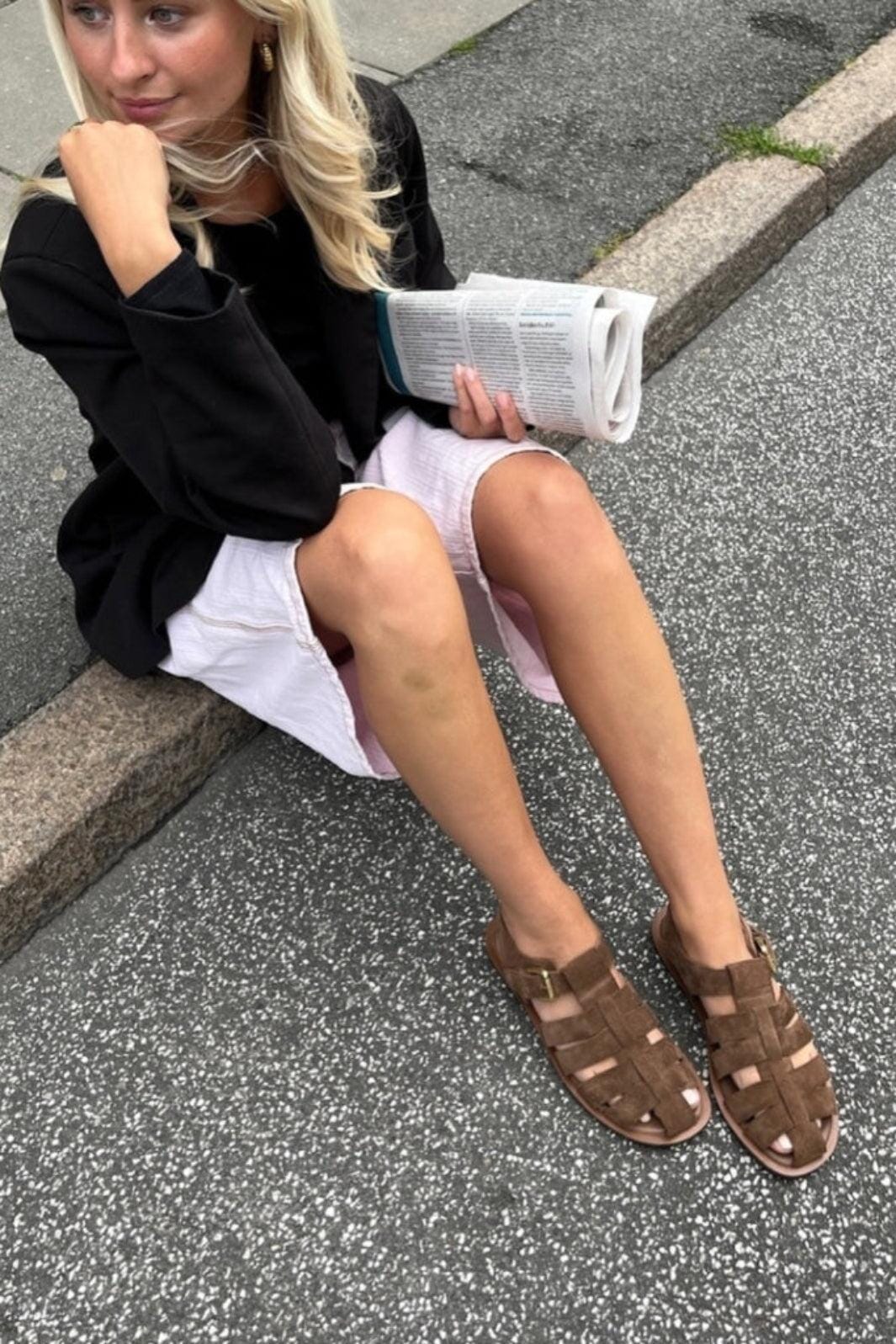 Bruine sandalen van Copenhagen Shoes, gemaakt van suède. De sandalen hebben meerdere bandjes over de voorvoet en een verstelbare gesp aan de zijkant.