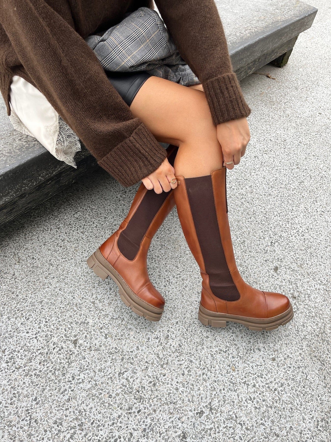 Knielange laarzen van cognackleurig leer met donkere elastische panelen aan de zijkanten. De TPR-zool heeft een chunky ontwerp dat goede ondersteuning biedt aan de voet.
