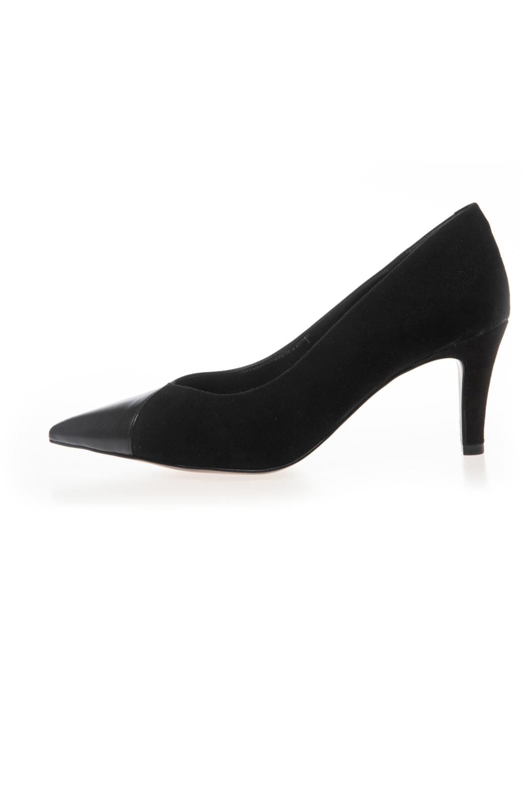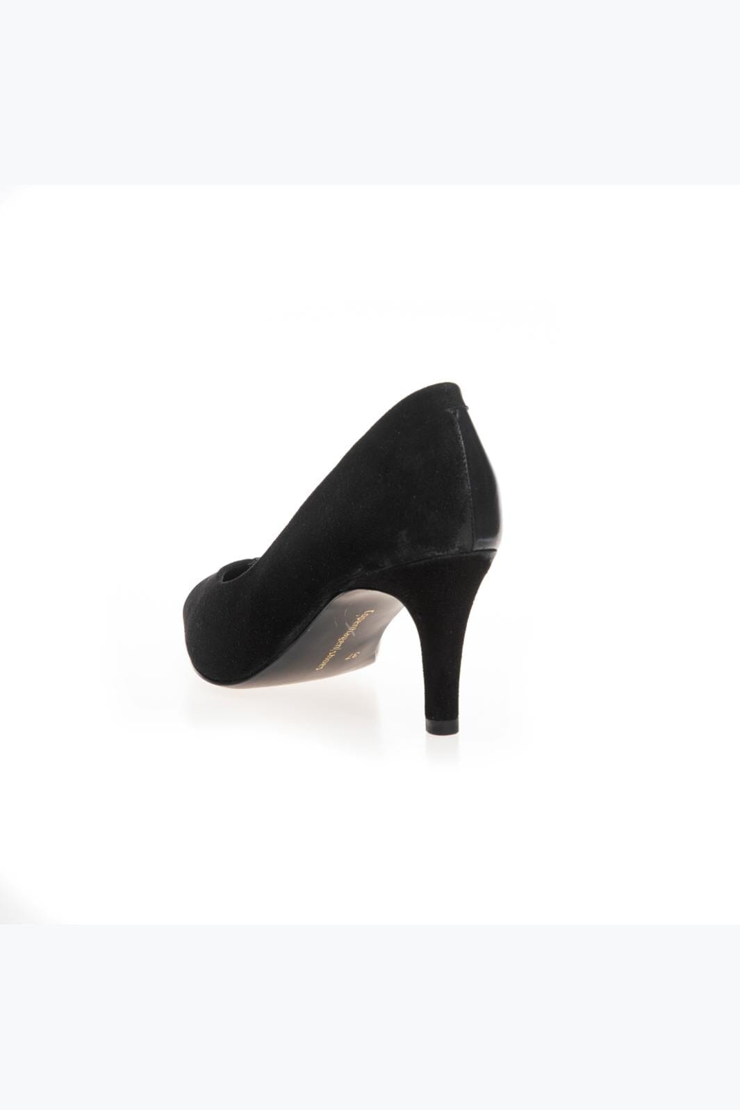 Zwarte stilettos van Copenhagen Shoes met spitse neus en stilettenhak. De schoen is vervaardigd uit een combinatie van leer aan de binnenkant en suède aan de buitenkant.