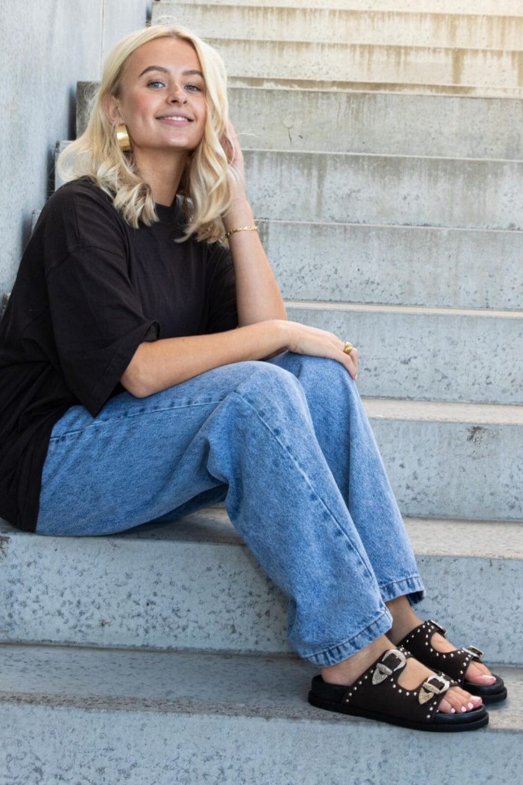 Donkerbruine sandaal van Copenhagen Shoes in suède met twee gespen en studs langs de rand. De sandaal heeft een platte zool en open teen.
