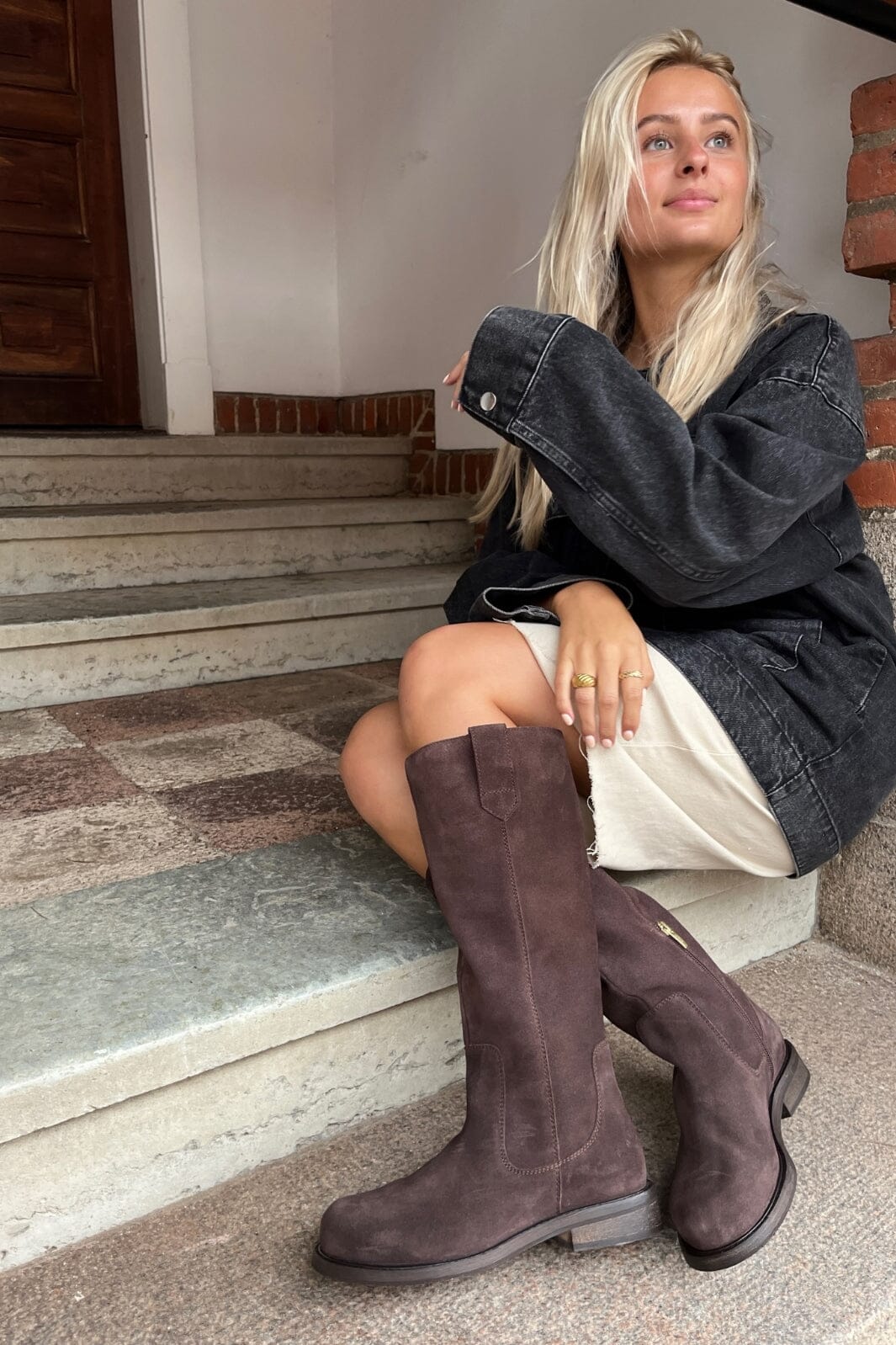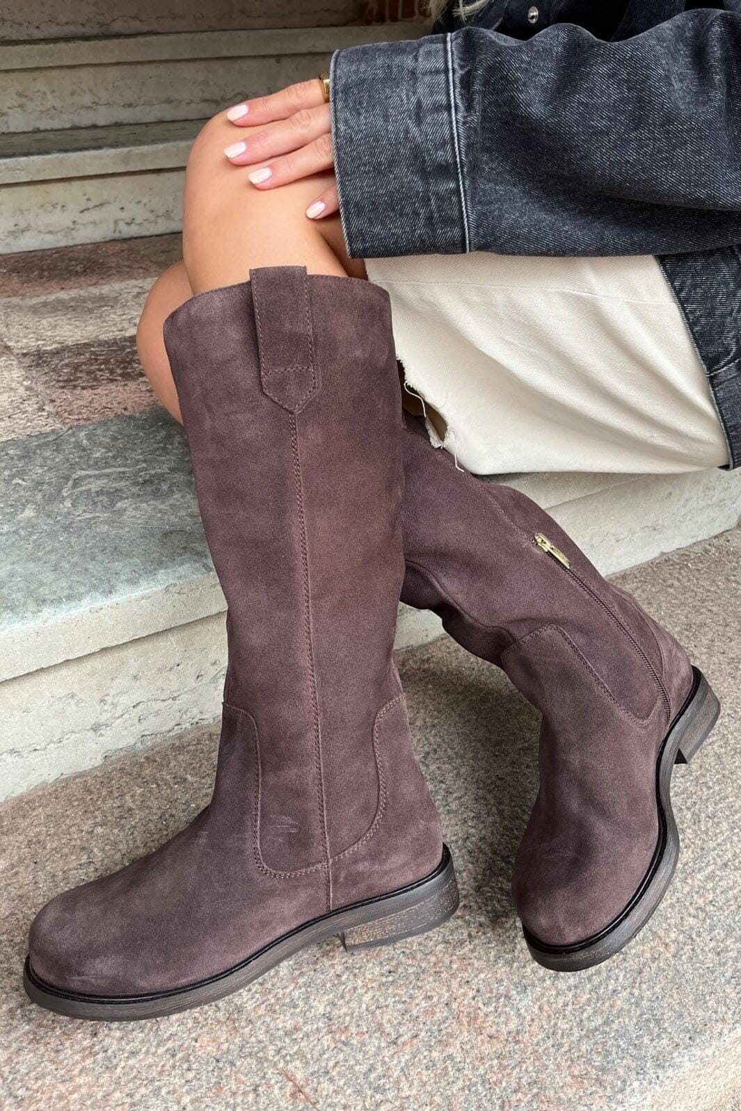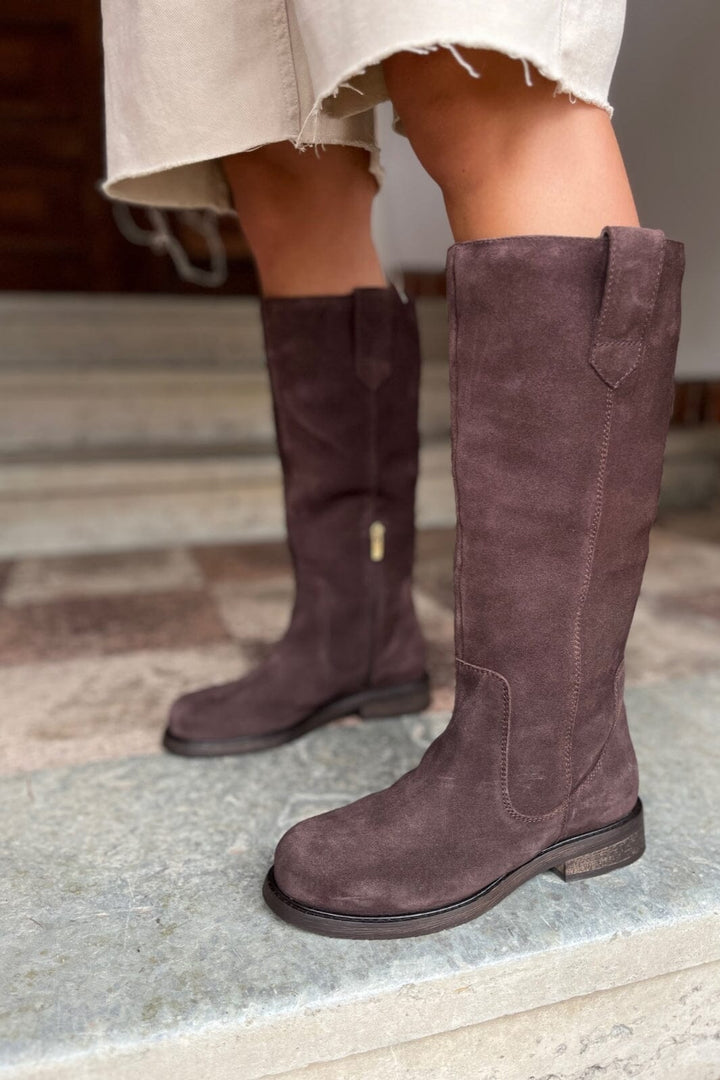Knielange laarzen van bruin suède met een ronde neus. De laars heeft een lage blokhak en een rits aan de zijkant. De bruine tint geeft de laars een rustieke uitstraling.