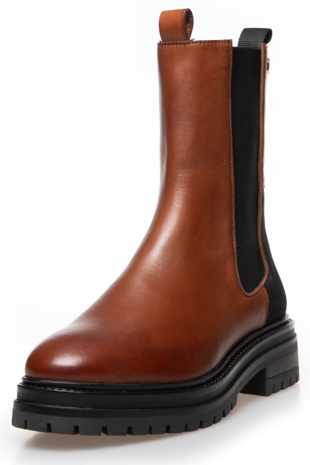 Laarsjes van Copenhagen Shoes in een combinatie van cognac, zwart en bruin leer. Een robuuste laars met blokhak en elastische zijkanten.