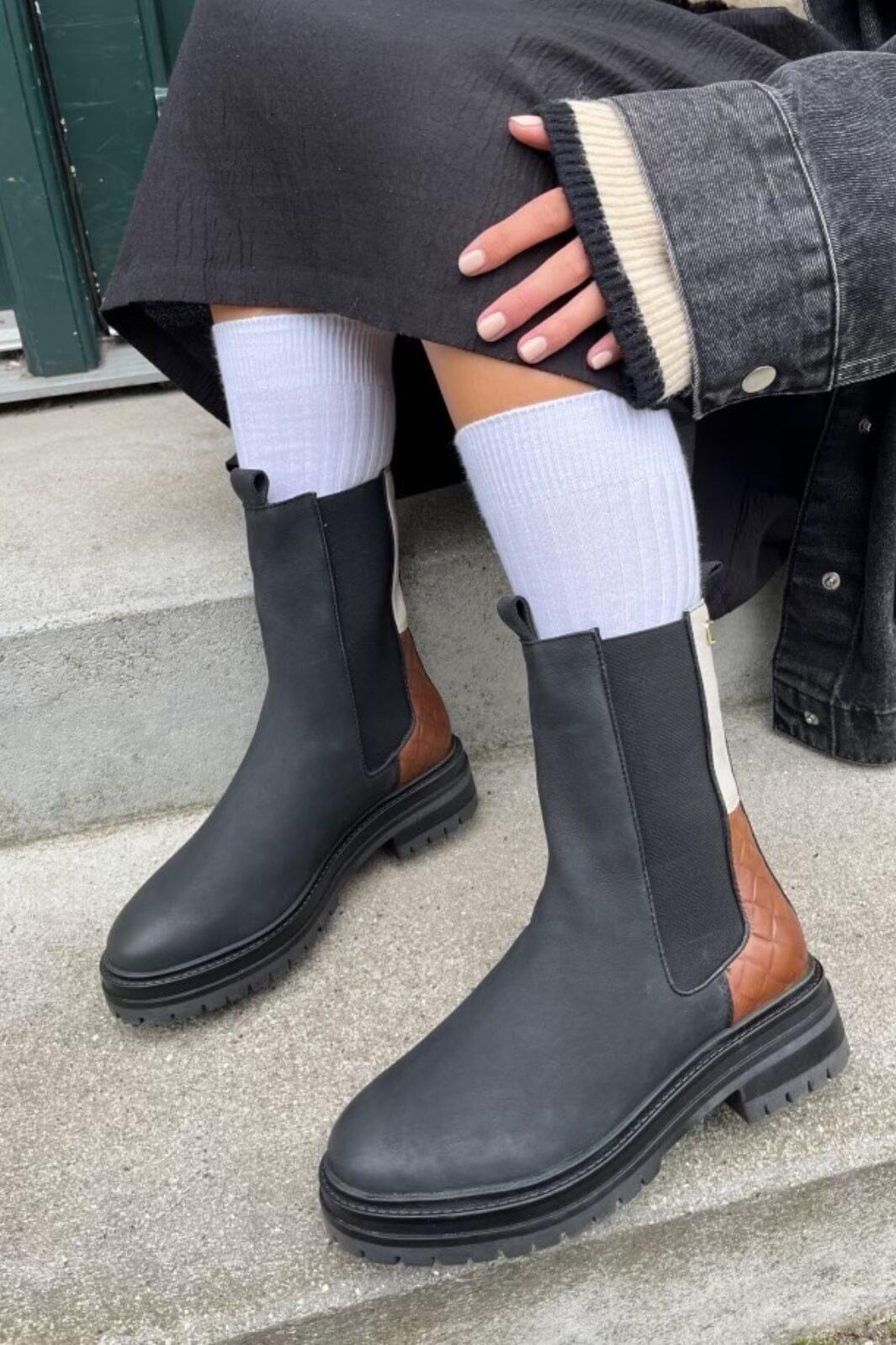 Leren laarzen van Copenhagen Shoes met zwart, bruin en beige kleurcombinatie. De laarzen hebben een blokhak en elastische sluiting aan de zijkanten.