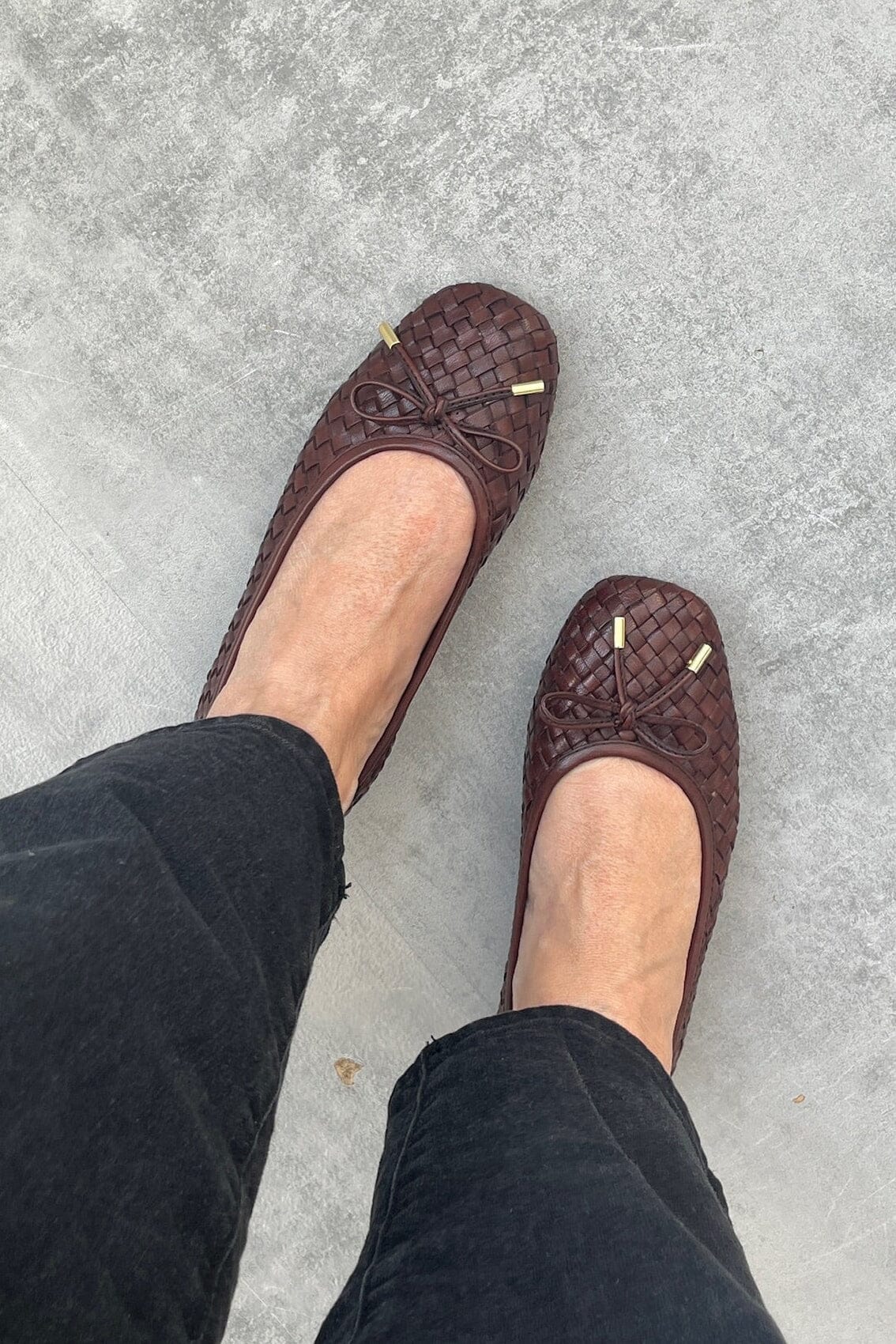 Ballerina's van Copenhagen Shoes in donkerbruin leer met een gevlochten oppervlak en een decoratieve strik aan de voorkant met metalen uiteinden.