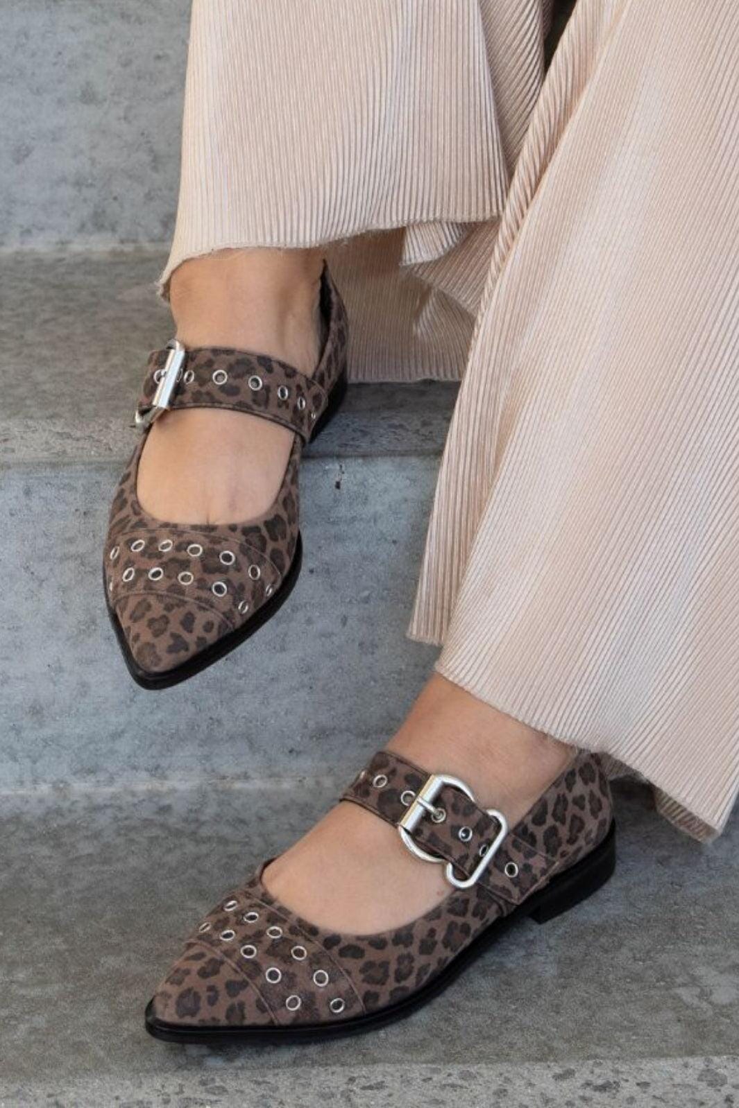 Suède schoenen van Copenhagen Shoes met bruin luipaardpatroon. De schoen heeft een spitse neus en een gesp-sluiting met studs als detail. De platte hak biedt goede ondersteuning.