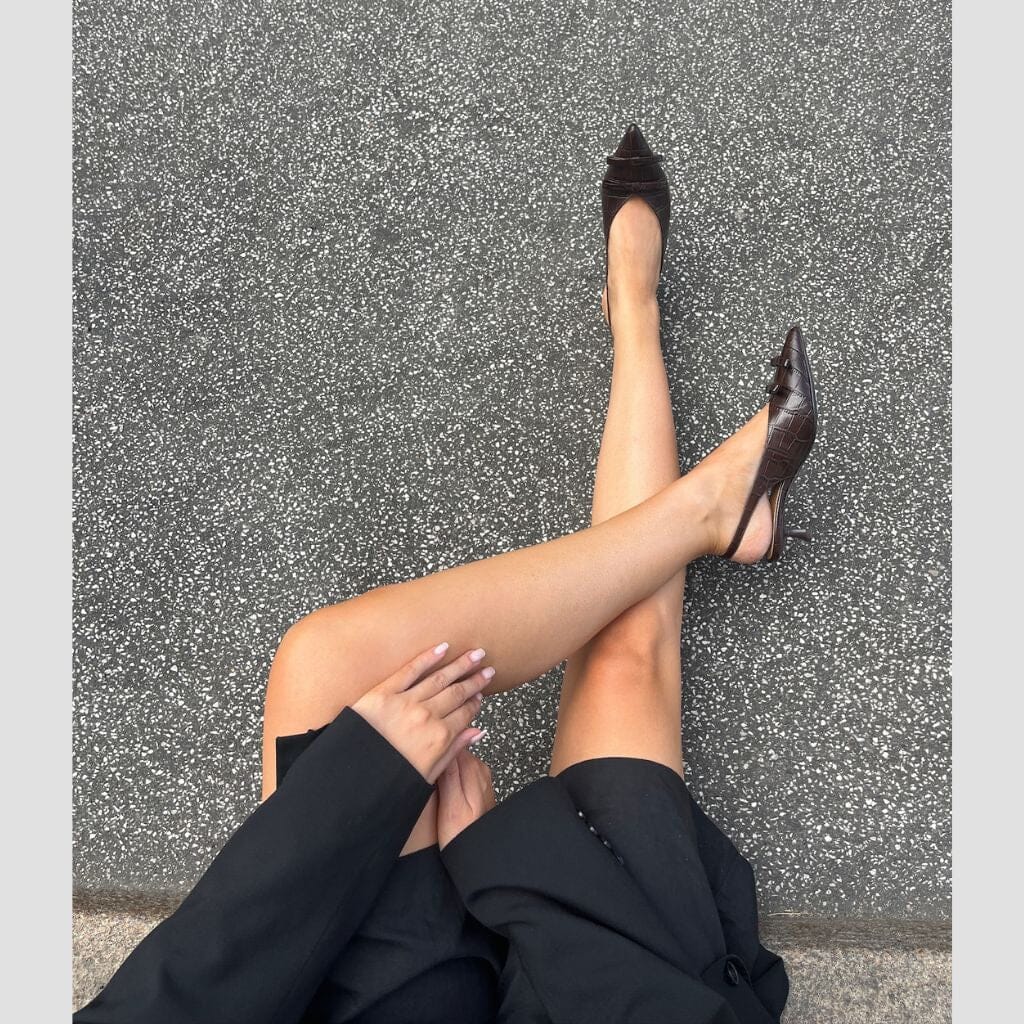 Slingback-schoenen van Copenhagen Shoes in donkerbruin leer met krokodillenstructuur. De schoenen hebben een spitse neus en een stilettohak en zijn geschikt voor feestelijke en formele gelegenheden.