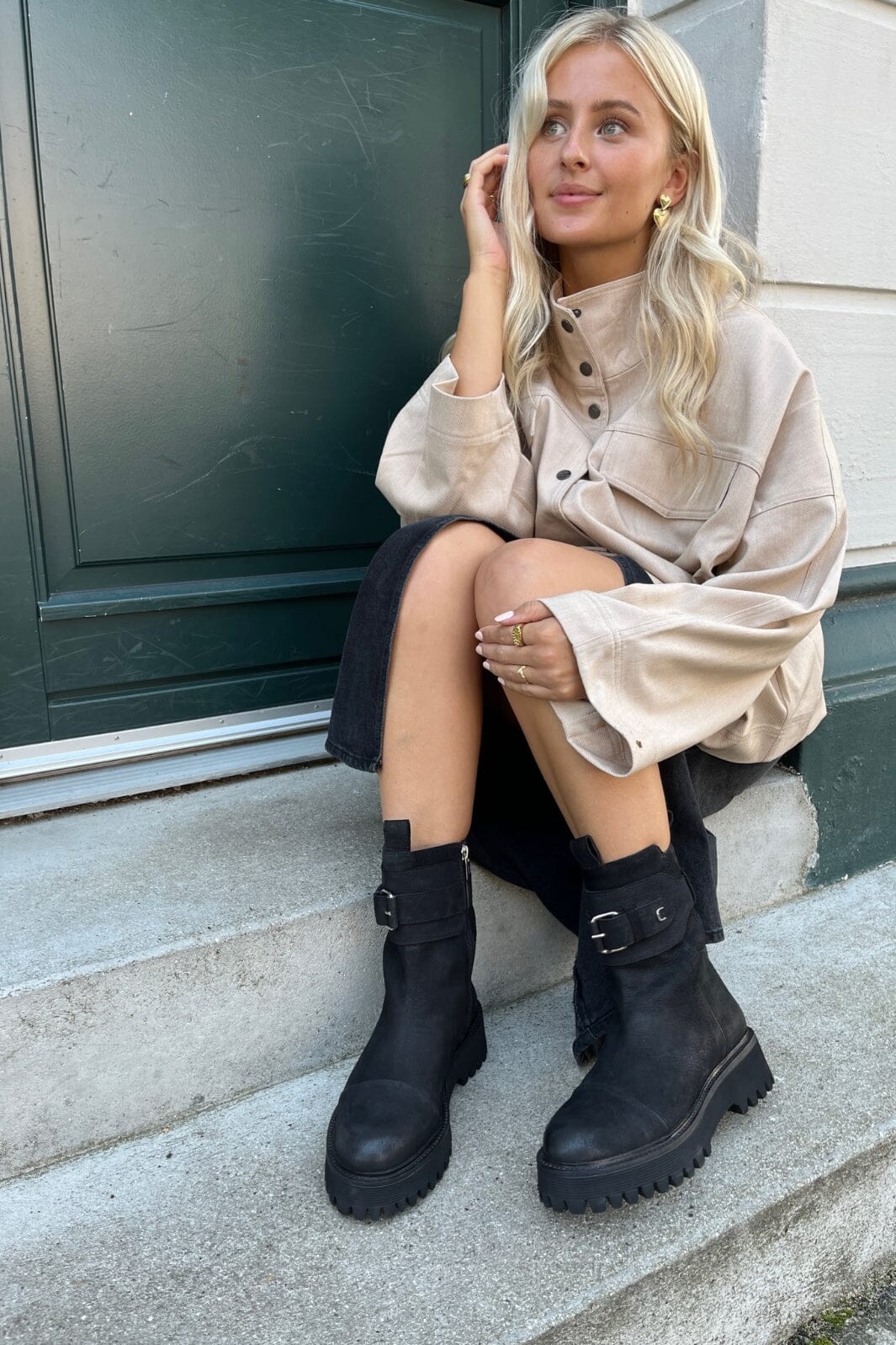 Zwarte enkellaarsjes van Copenhagen Shoes in nubuck met stevige zool. De laarzen hebben een robuuste constructie met rits en gesp aan de zijkant.