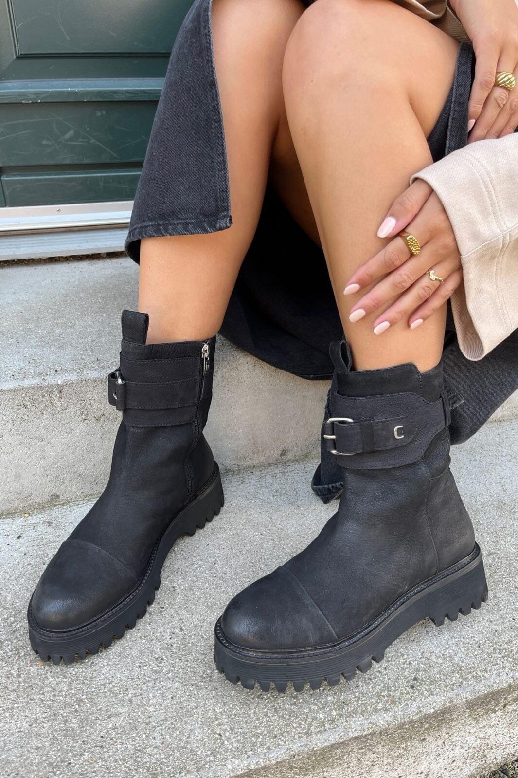 Zwarte enkellaarsjes van Copenhagen Shoes in nubuck met stevige zool. De laarzen hebben een robuuste constructie met rits en gesp aan de zijkant.