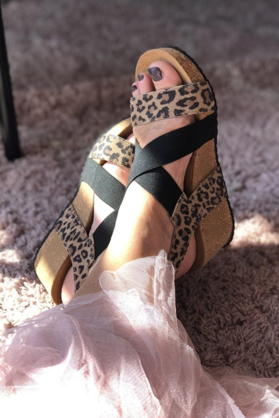 Sandalen van Copenhagen Shoes met bruin luipaardmotief en zwarte gekruiste bandjes. De sandaal is gemaakt van soepel echt nubuckleer.