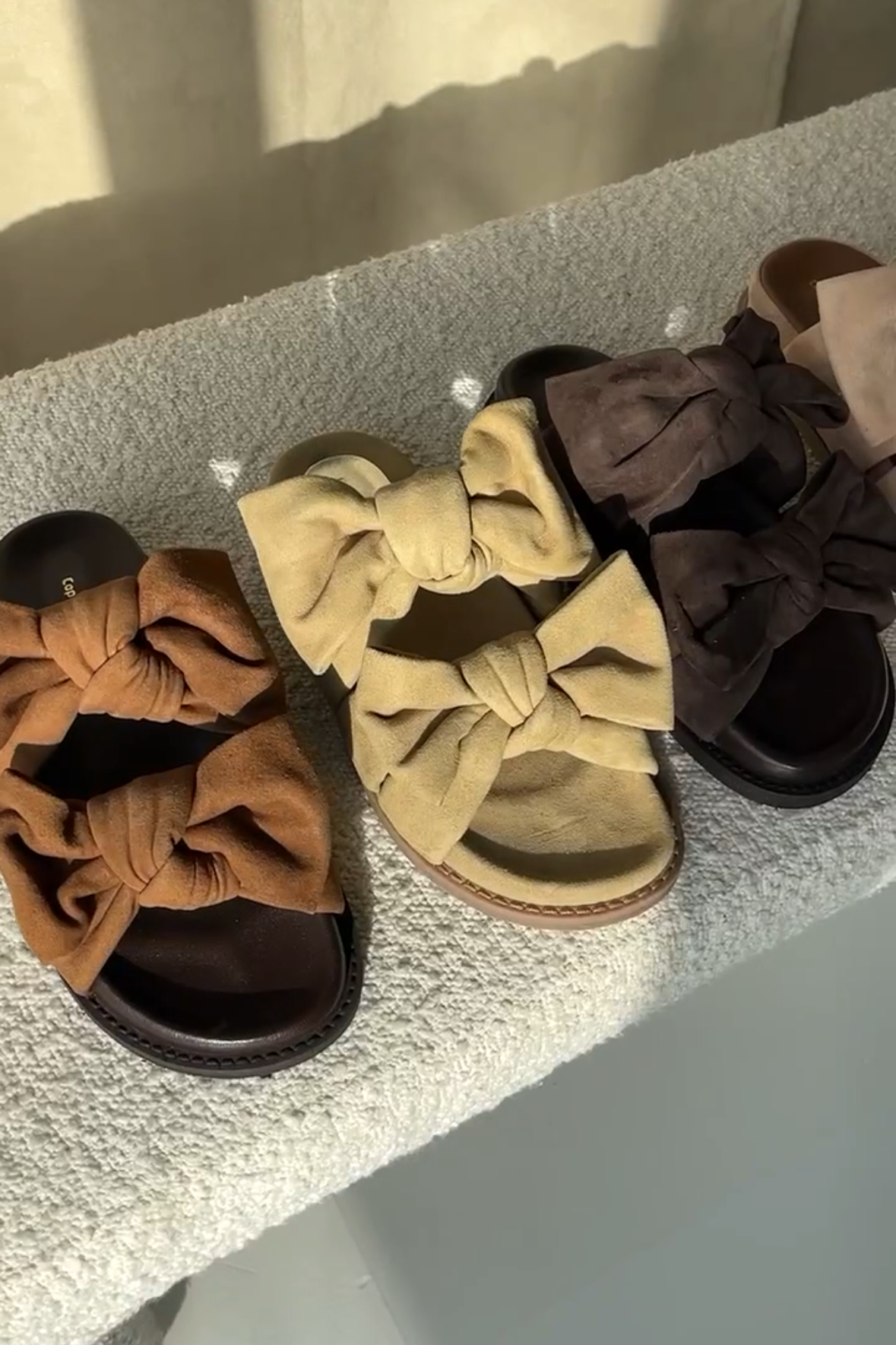 Sandalen van Copenhagen Shoes van zacht suède met een cognackleurig oppervlak. Het design heeft twee grote decoratieve strikken op de bandjes.
