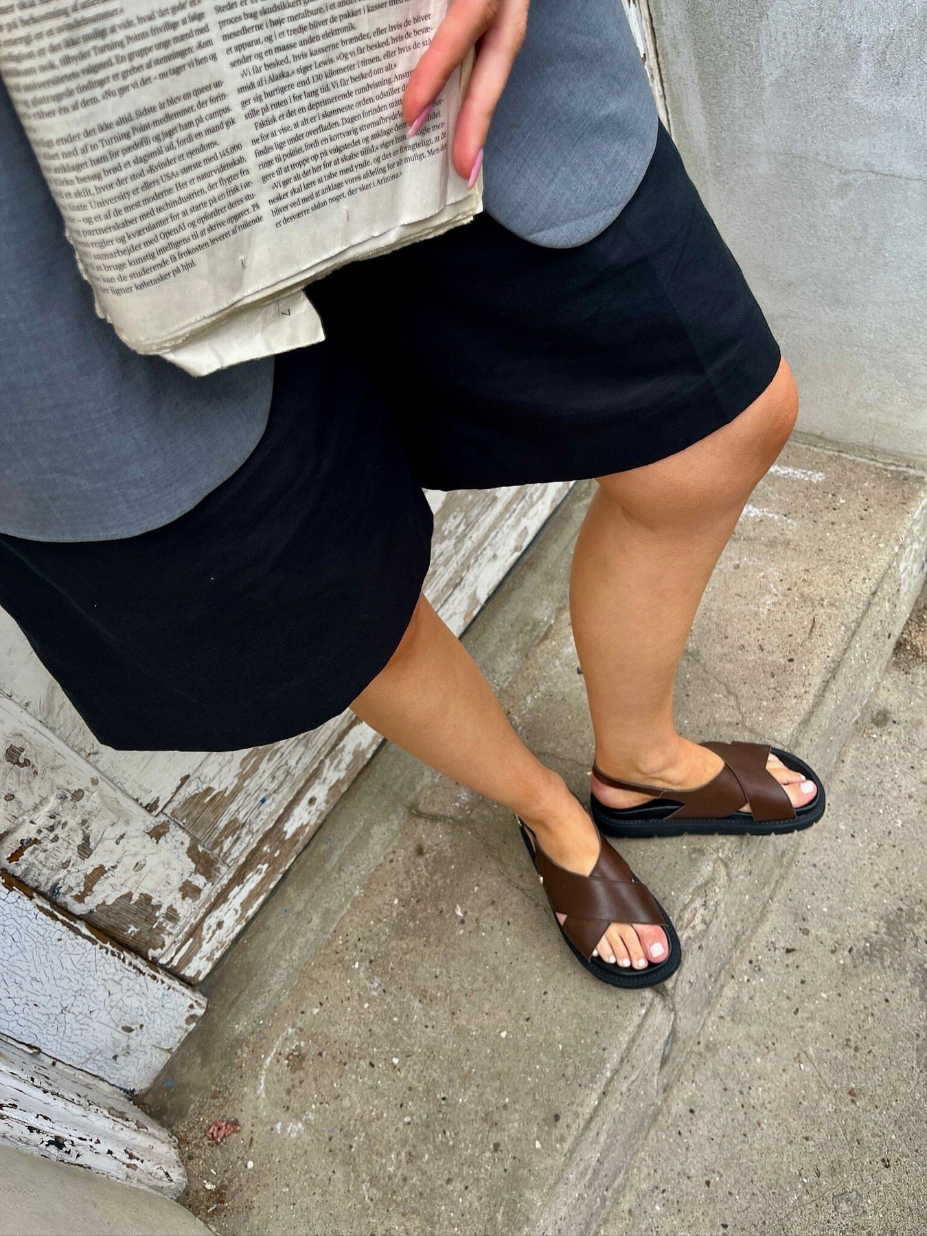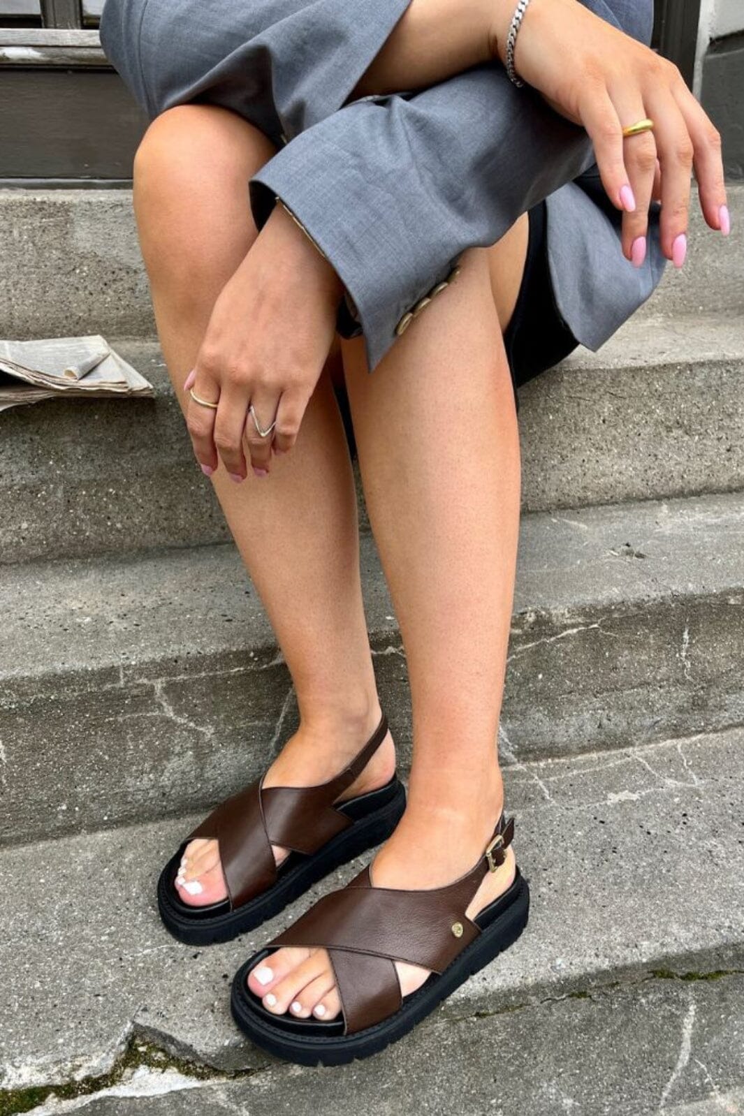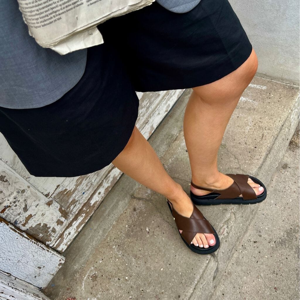 Donkerbruine sandaal van Copenhagen Shoes met kruisbanden en vergulde gesp. De sandalen hebben een zwarte chunky EVA-zool en zijn gemaakt van zacht leer met een verstelbare hielband.