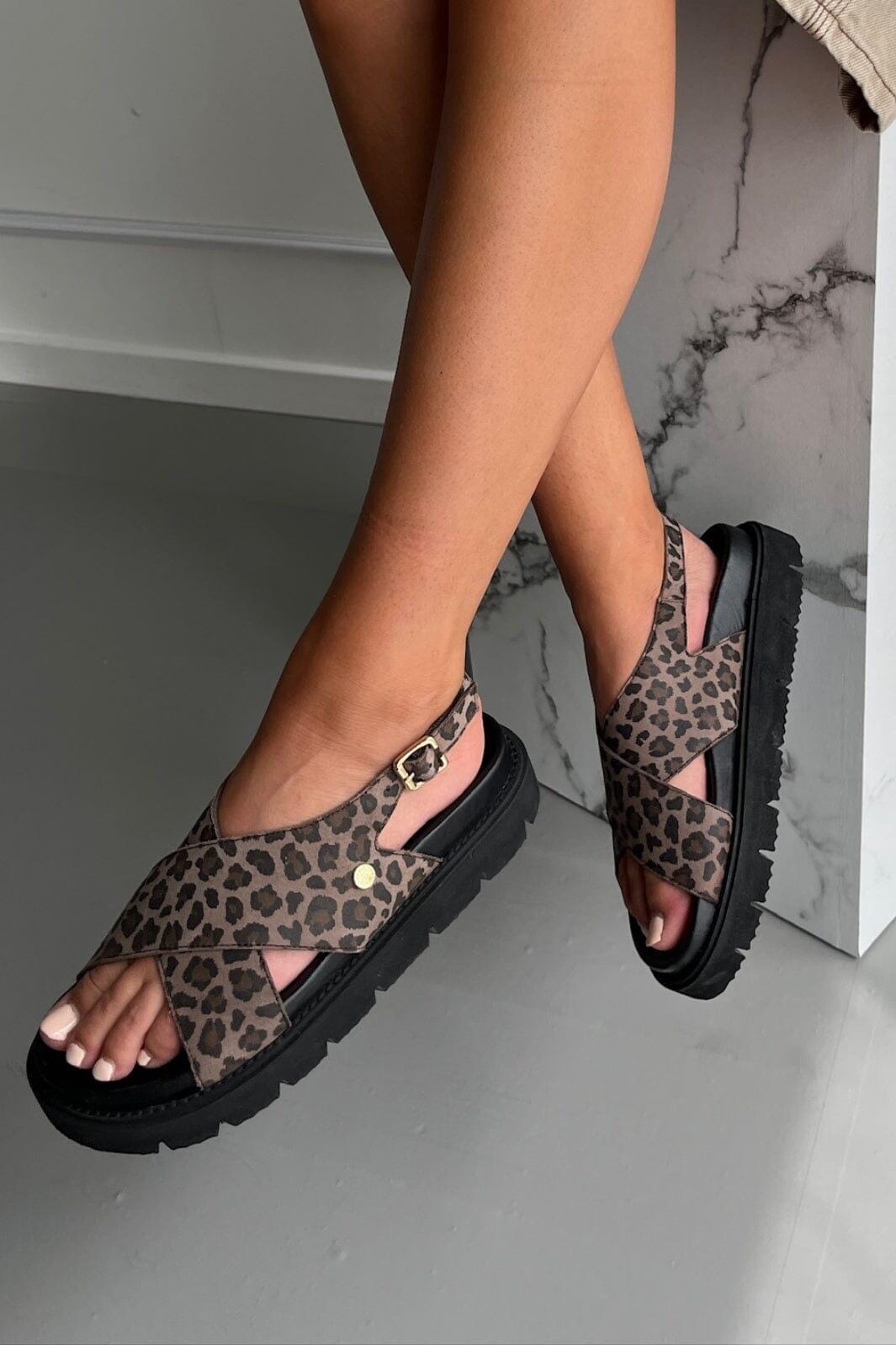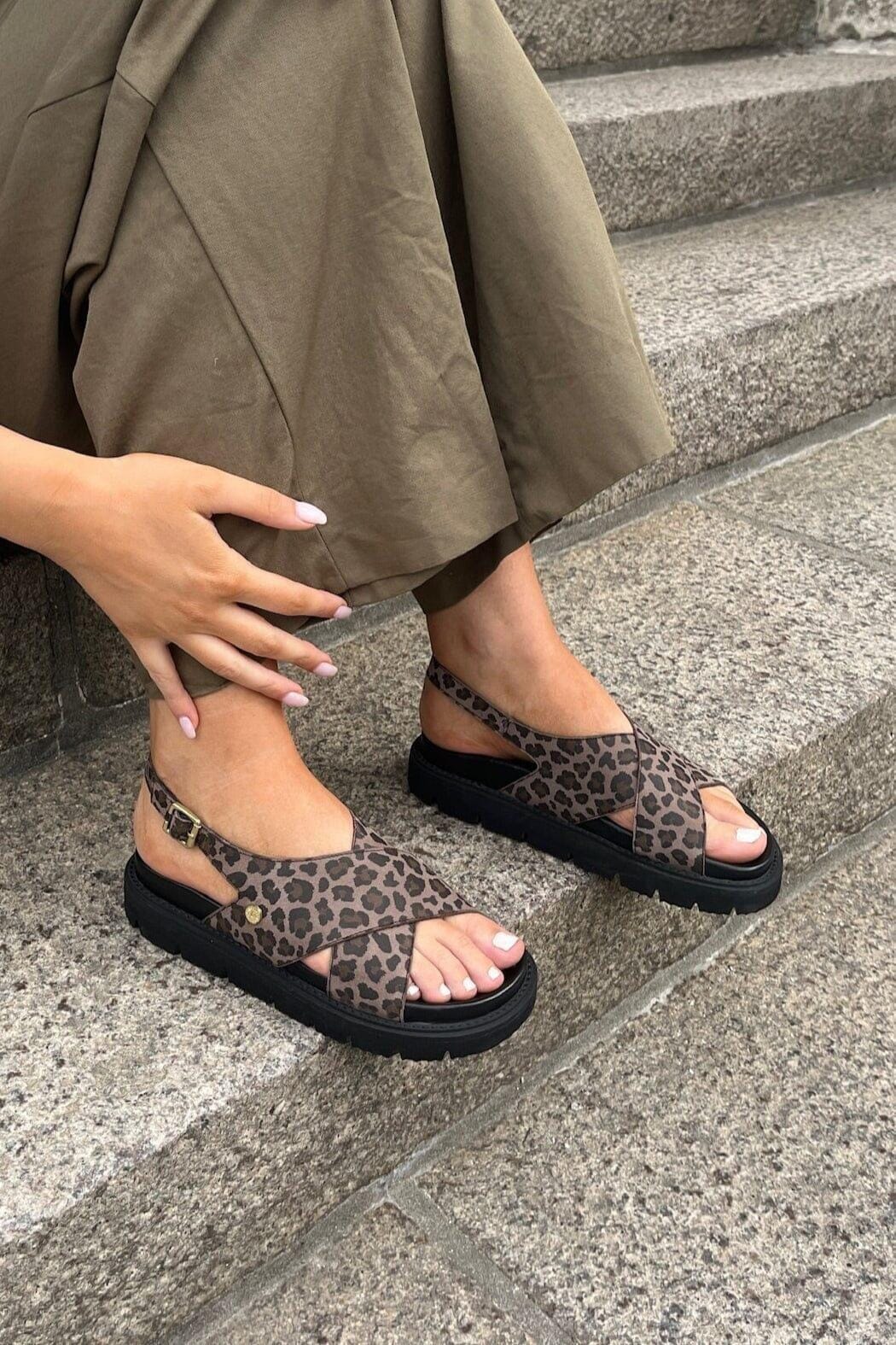 Sandalen van Copenhagen Shoes in suède met zwart en bruin luipaardprint. De sandalen hebben kruisende banden over de voet en een praktische gesp-sluiting bij de enkel.