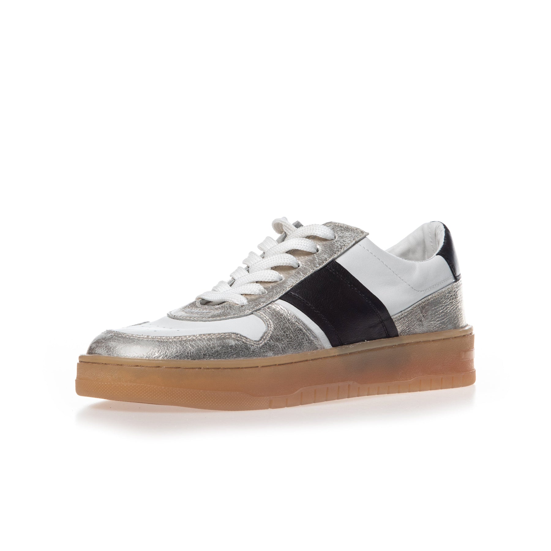 Sneakers van Copenhagen Shoes van zilverkleurig leer. De schoen heeft zilver- en witkleurige panelen met een zwarte streep aan de zijkant en een dikke bruine zool.