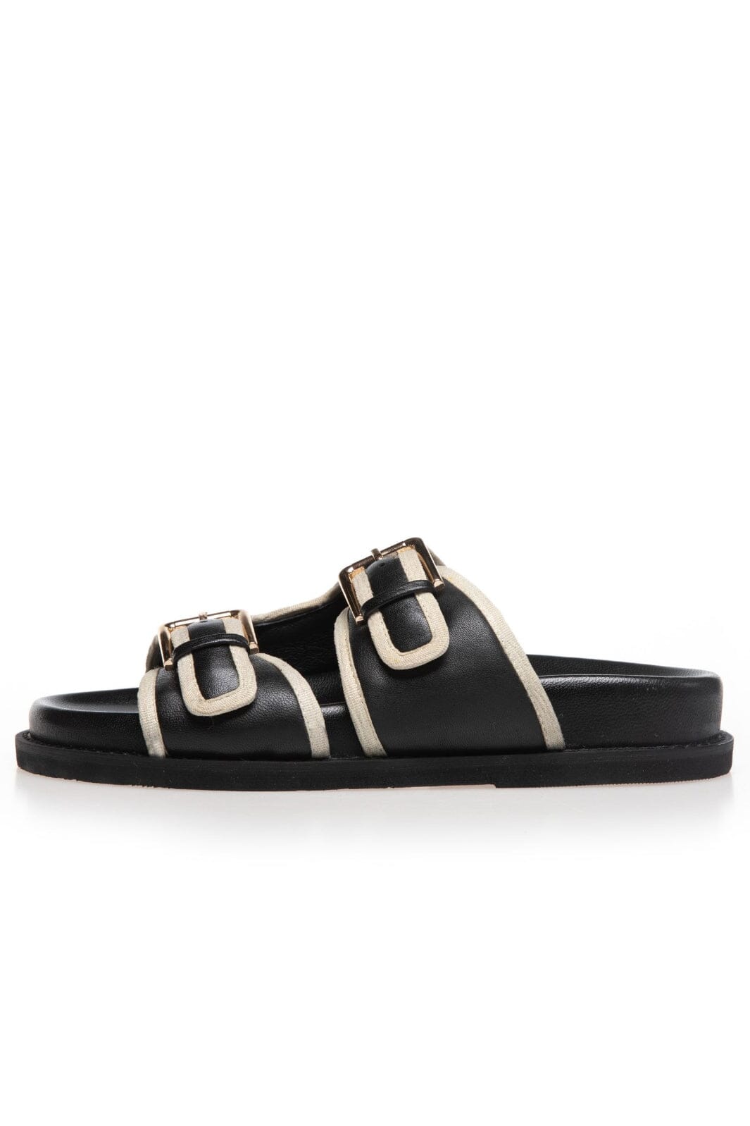 Leren sandalen van Copenhagen Shoes in zwart en beige. De sandalen hebben een open teen en een gesp die het gemakkelijk maakt om ze aan de voet aan te passen.