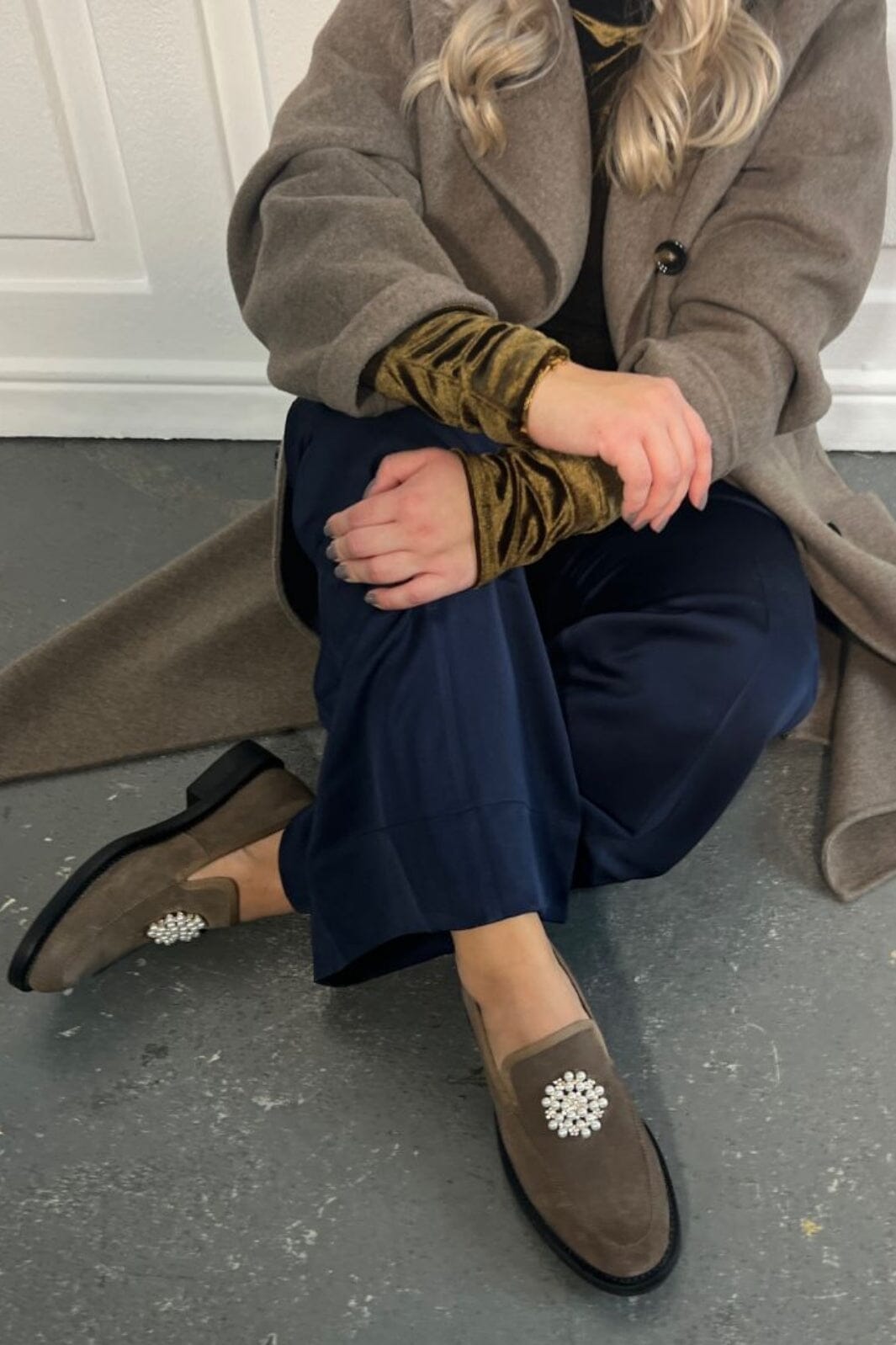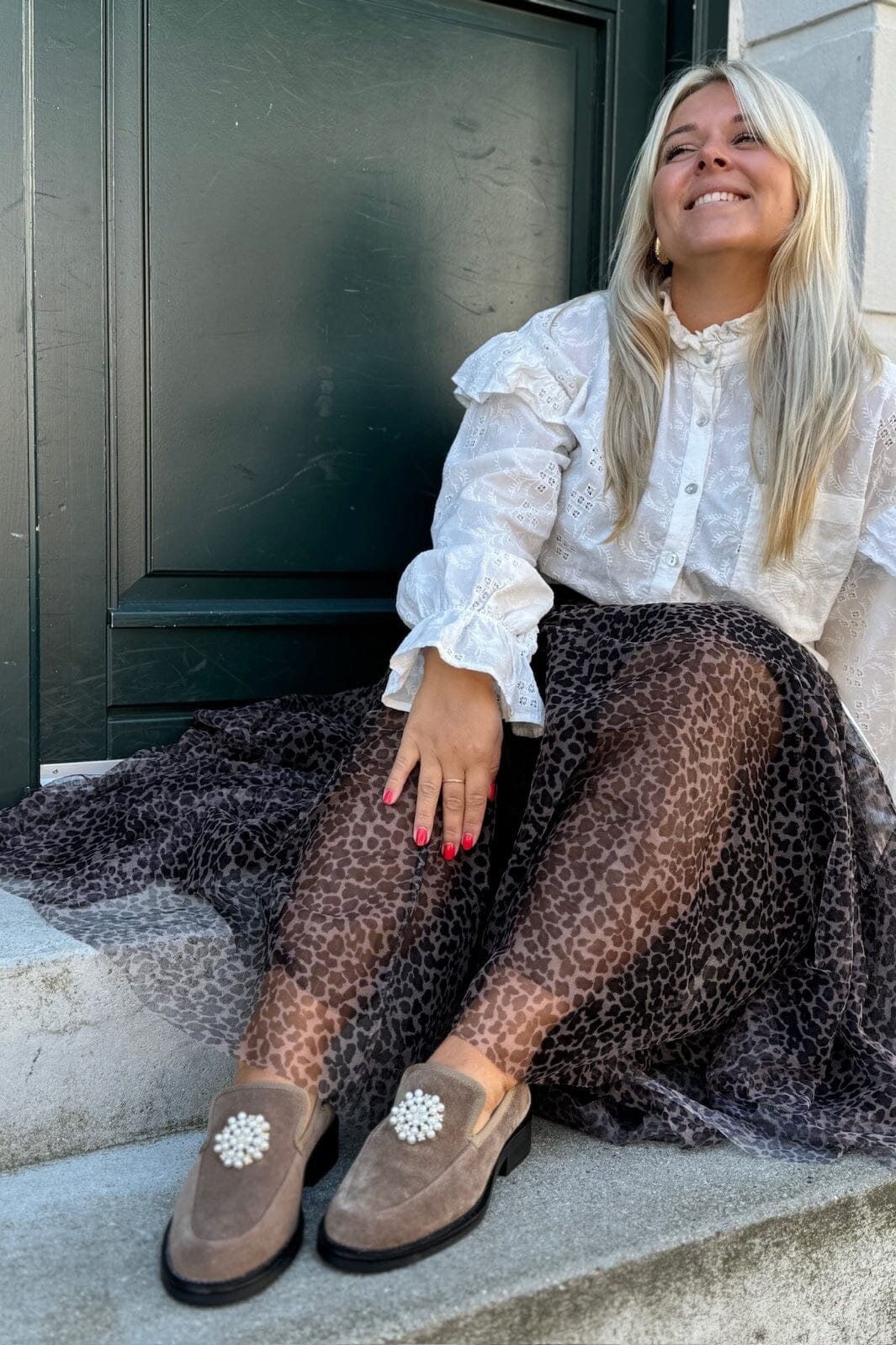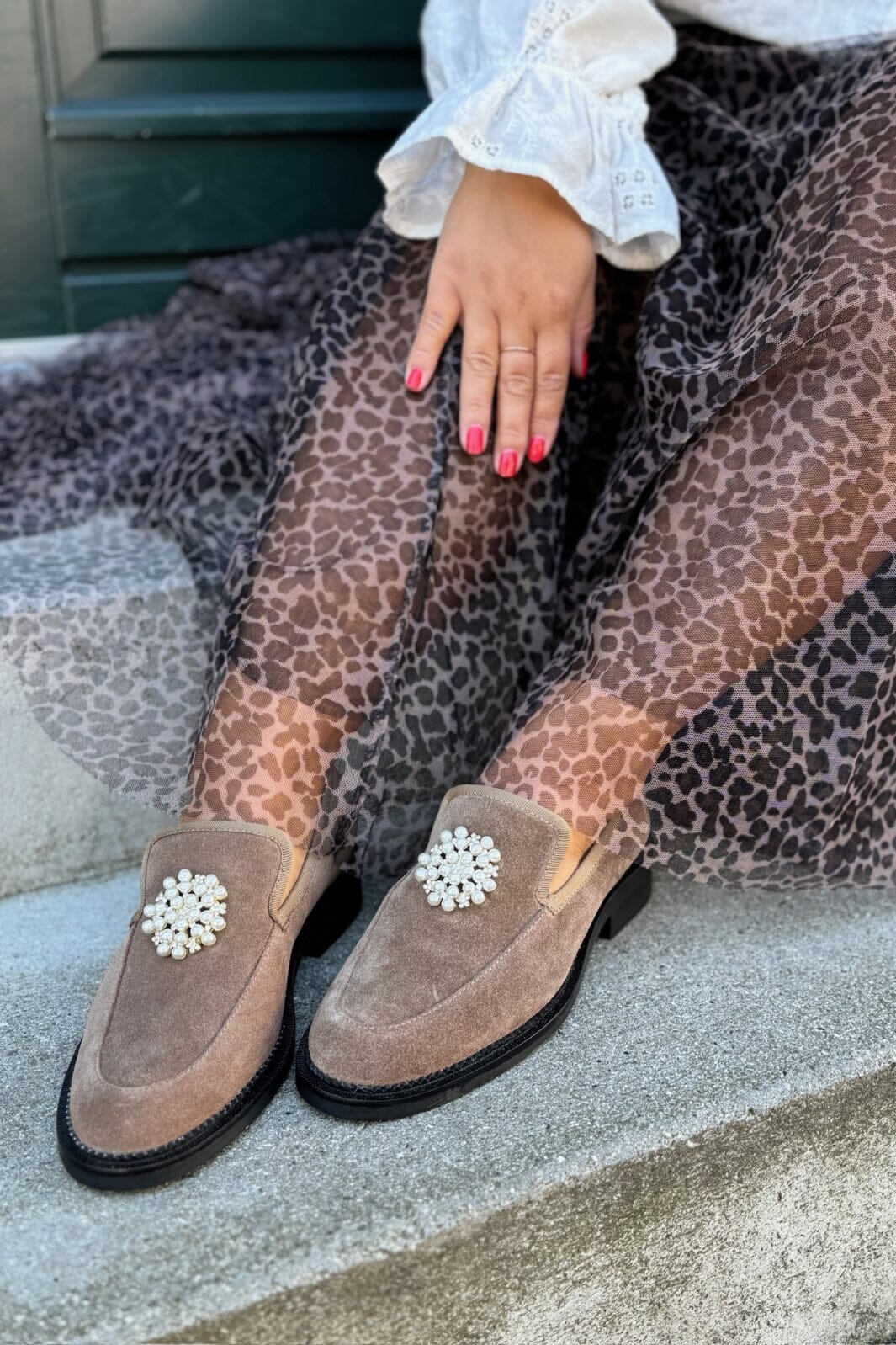 Bruine loafer van suède van Copenhagen Shoes. Deze heeft pareldetails aan de voorkant en een lage blokhak, waardoor hij praktisch is voor zowel dagelijks gebruik als feesten.