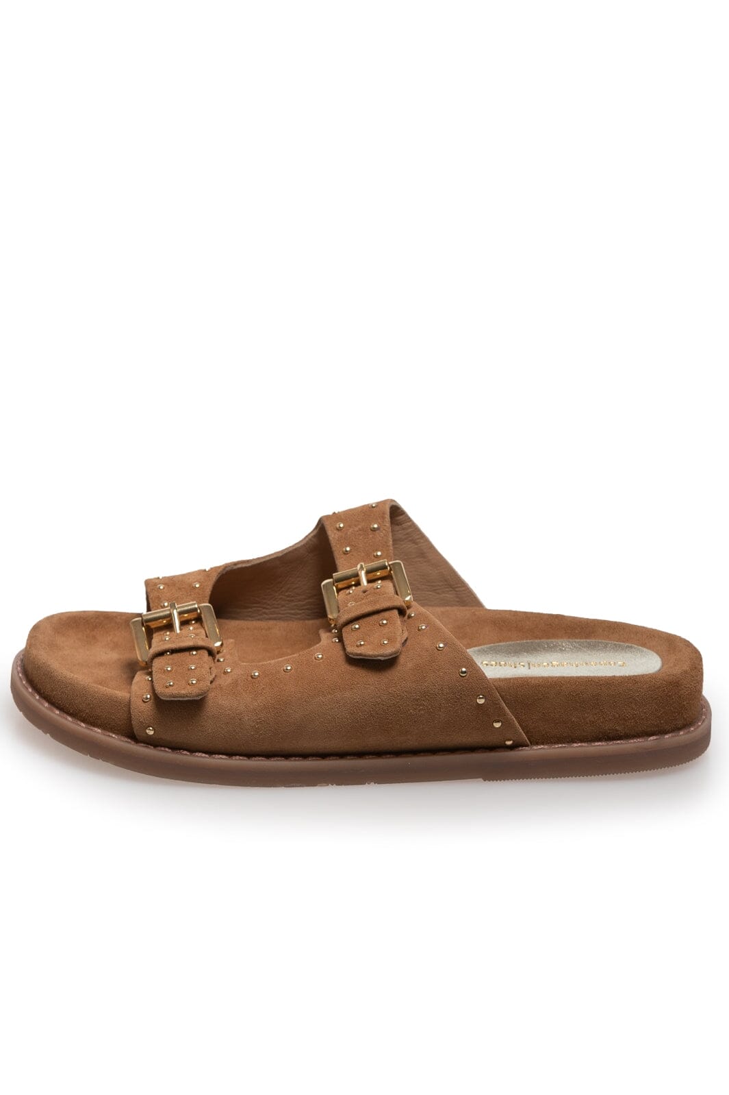Bruine suède sandalen met gespen en studs. De sandalen zijn vervaardigd volgens de milieunormen van de Leather Working Group met duurzame materialen en hernieuwbare energie.