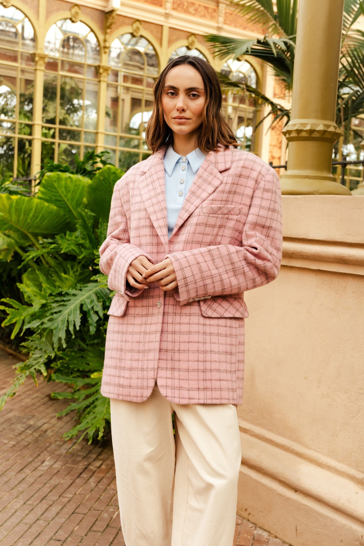 Roze geruite blazer van Cras met overhemdkraag en losse pasvorm. De blazer heeft lange mouwen en pailletten die een feestelijke toets aan het geruite ontwerp geven.