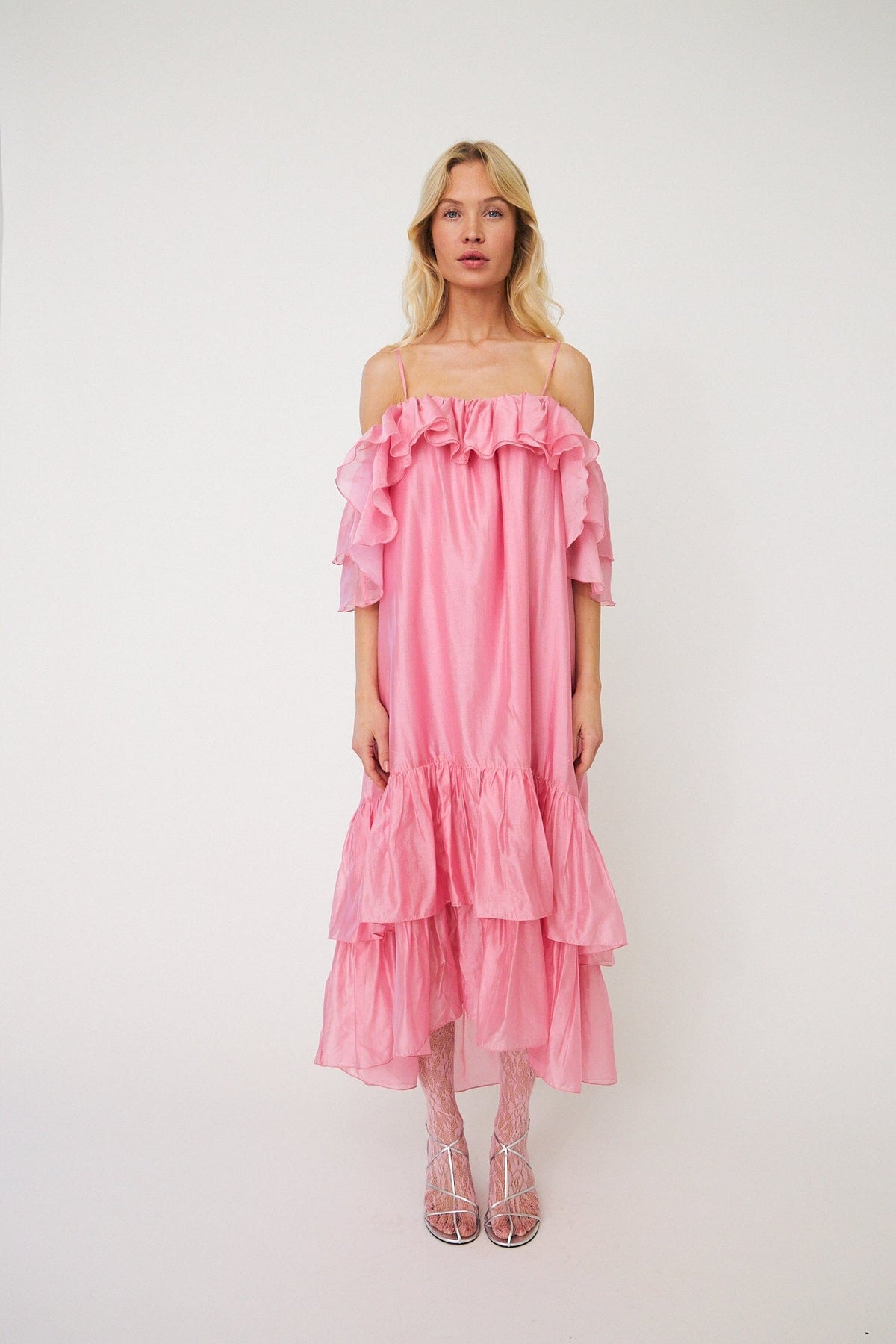 Roze jurk van Cras in 84% lyocell en 16% polyester. De jurk heeft plooien en volants, evenals een off-shoulder ontwerp met spaghetti-bandjes. Het heeft een oversized pasvorm en reikt tot de kuit.