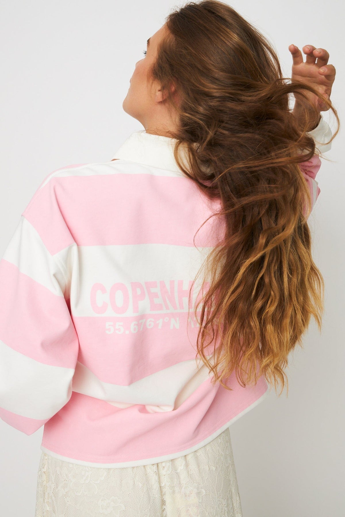 Roze en witte blouse van Cras met strepen en polokraag. De oversized blouse heeft lange mouwen en geborduurde Voilà-tekst op de voorkant. Het Cras-logo is zichtbaar op de mouw.