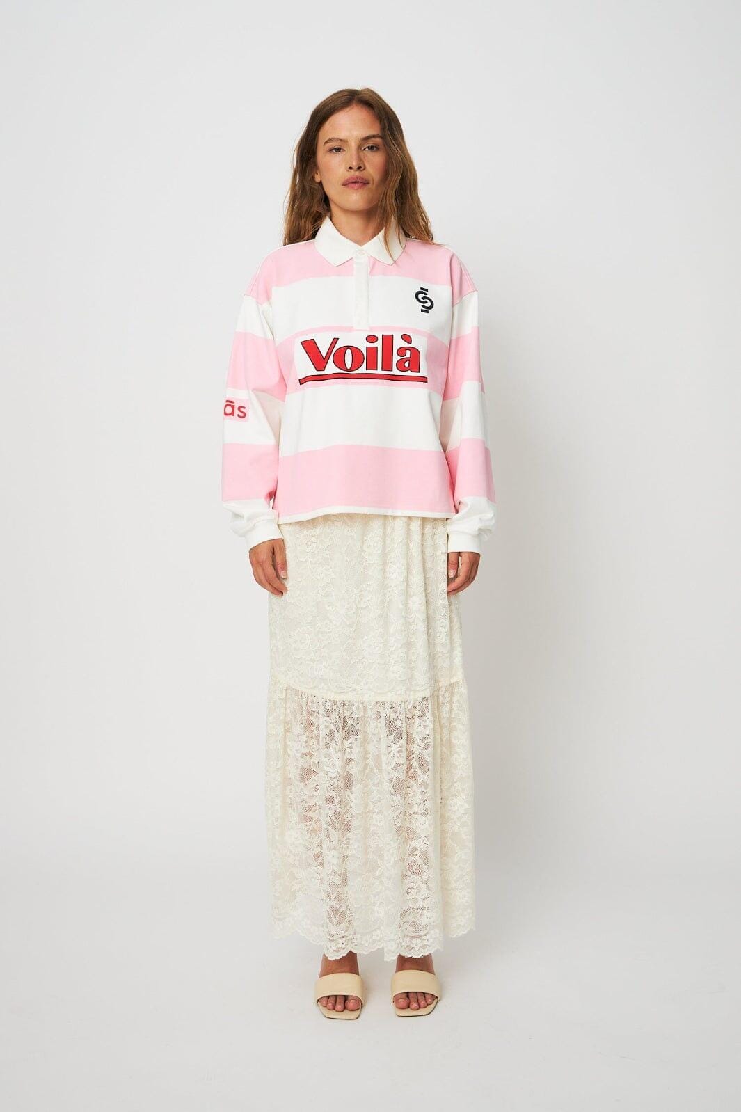 Roze en witte blouse van Cras met strepen en polokraag. De oversized blouse heeft lange mouwen en geborduurde Voilà-tekst op de voorkant. Het Cras-logo is zichtbaar op de mouw.