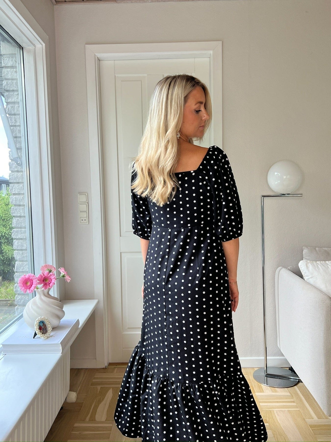 Zwarte enkellange jurk met witte stippen. De vierkante halslijn en 3/4-mouwen geven de jurk een strakke en eenvoudige uitstraling. De volant aan de onderkant creëert beweging in de losse pasvorm.