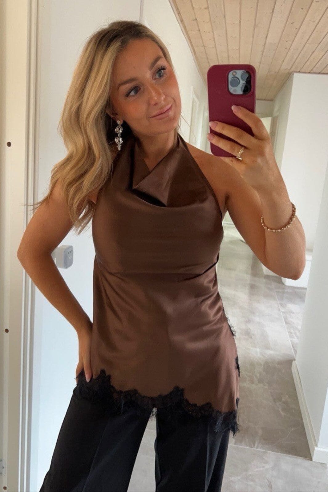 Halterneck-top van Dear Molly in een bruine kleur. De top heeft een kanten rand langs de zoom en een gedrapeerde halslijn in halterneck-stijl.
