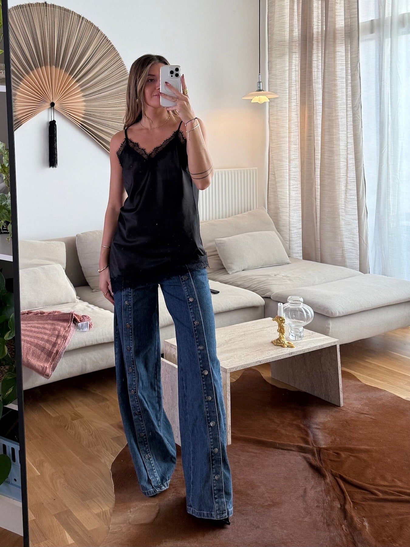 Zwarte top van Dear Molly met kant langs de halslijn en onderkant. De top heeft dunne spaghettibandjes en een V-hals.