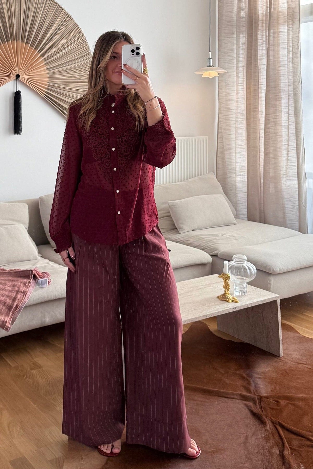 Wijnrode blouse van Dear Molly met bloemen- en polkadotpatroon. De blouse heeft borduursel, pareldetails en ruches, en wordt gesloten met knopen.