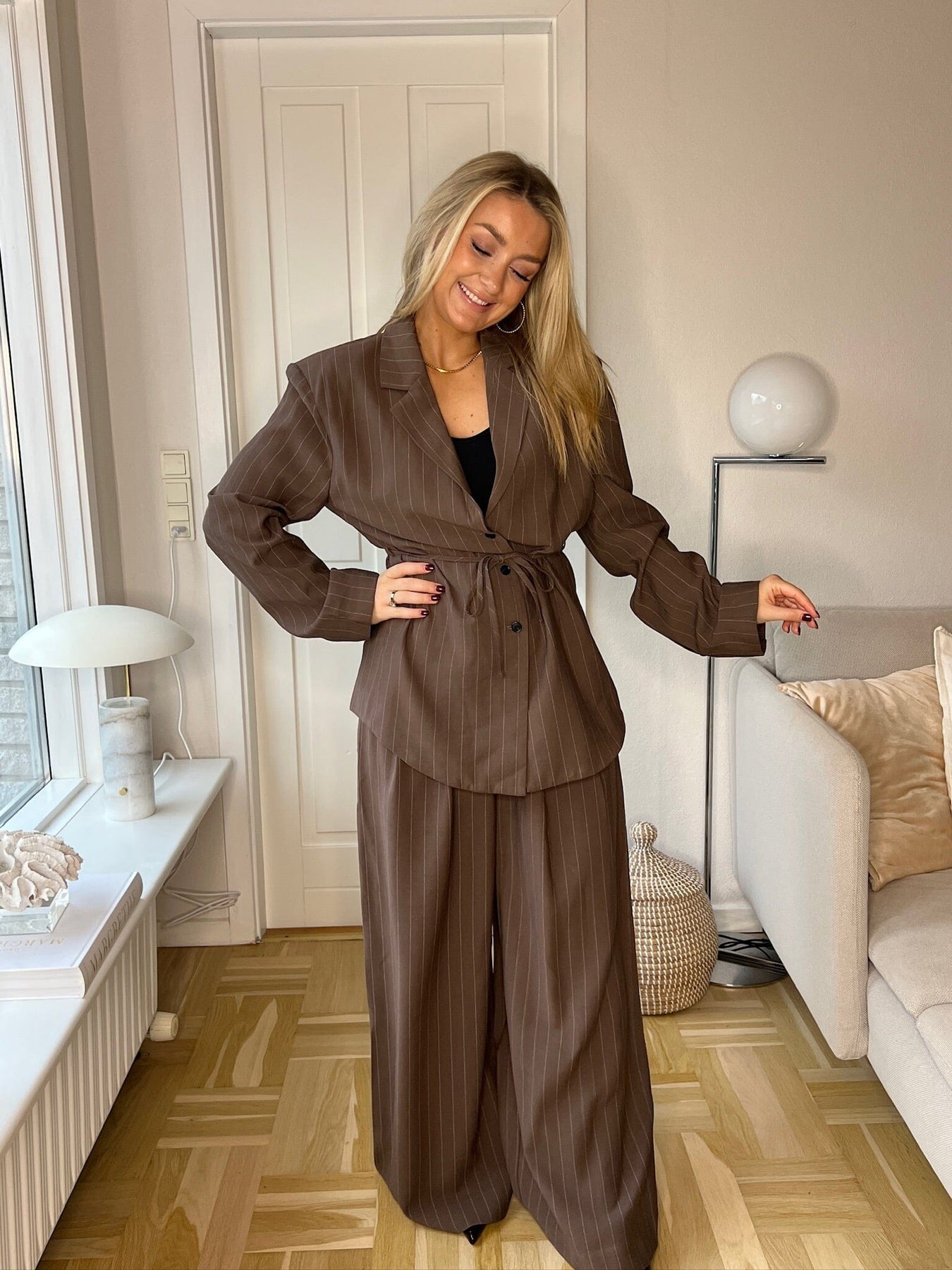 Bruine blazer van Dear Molly met krijtstreep. De blazer is gemaakt van een geweven materiaal en heeft een oversized pasvorm met V-hals en strikceintuur in de taille.