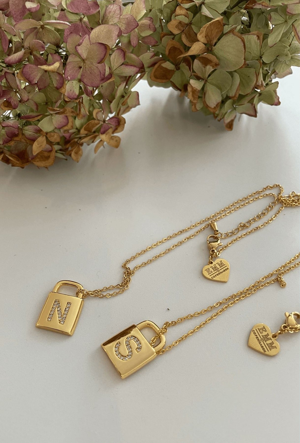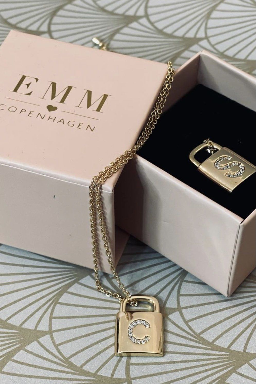 Verguldede ketting van EMM Copenhagen met een slotontwerp, waarbij je je eigen letter kunt kiezen. Het slot heeft een zirkonsteen op de letter en zit aan een ketting.