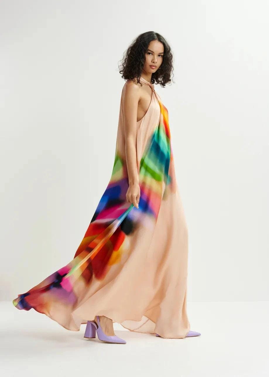 Lange jurk van Essentiel Antwerp met halterneck en gradientpatroon. De jurk heeft een kleurrijk ontwerp met zachte overgangen tussen de kleuren rood, blauw, groen en oranje op een lichte achtergrond.