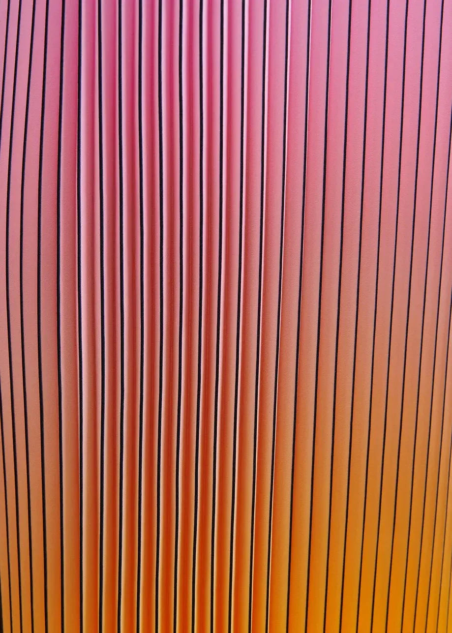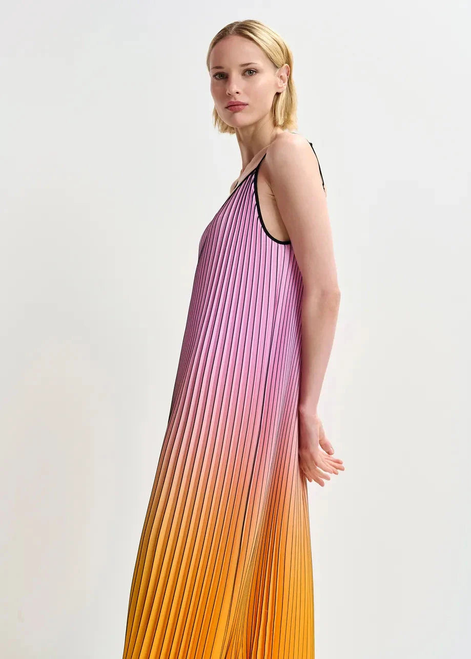 Lange jurk van Essentiel Antwerp met plooien en kleurverloop van roze naar oranje en geel. De zwarte bandjes en V-hals geven een mooi contrast met de kleuren.